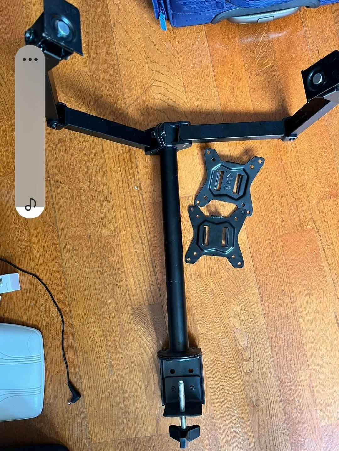 Selling a dual monitor desk mount in black. It appears to be in good condition and comes with the mounting plates. Great for creating more desk space and improving your setup!