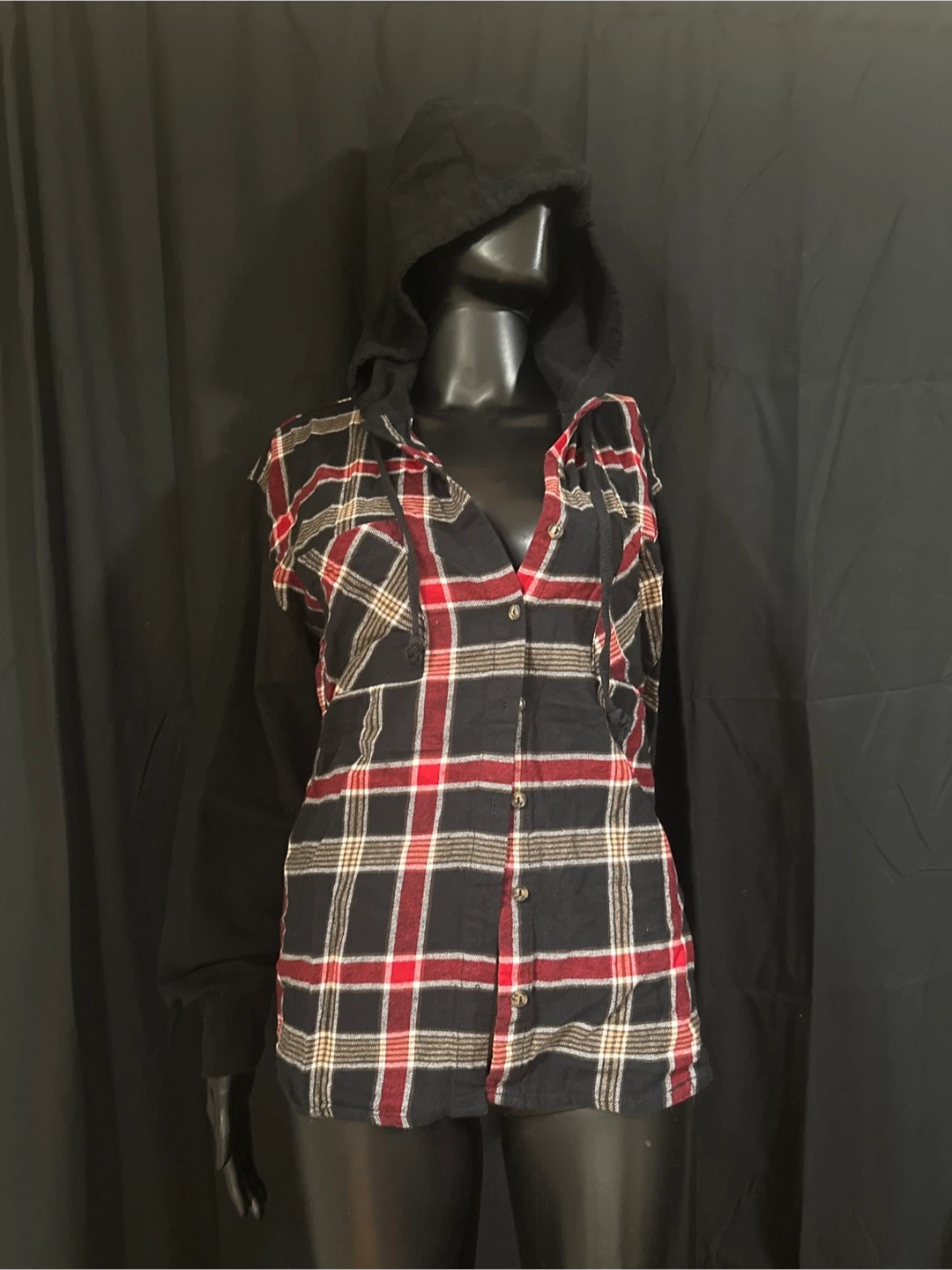 This long-sleeve hooded flannel shirt features a classic black, red, and white plaid pattern. It has a button-down front and a comfortable hood with a sherpa lining detail. Material is a soft flannel blend.