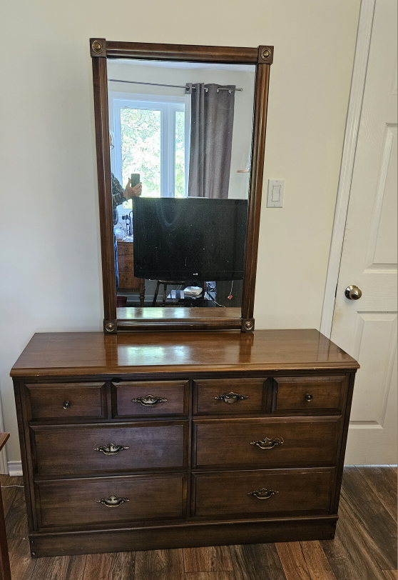 1 / 11 / 1Buy & SellWooden Dresser with Mirror - Dark BrownWooden Dresser with Mirror - Dark Brown$109Dark brown wooden dresser with a matching mirror. Features six drawers for ample storage. A classic piece to add to your bedroom!ConditionGoodDimensions48x18x31WHERE TO MEETCheck LocationView MapSELLERverifiedjimWaterdown691 review0 chats·0 favorites·43 viewsSEND CHAT TO SELLERHi jim! I’m interested in your listing.Hi jim! I’m interested in your listing.Get the Karrot app to chatSign In to chat