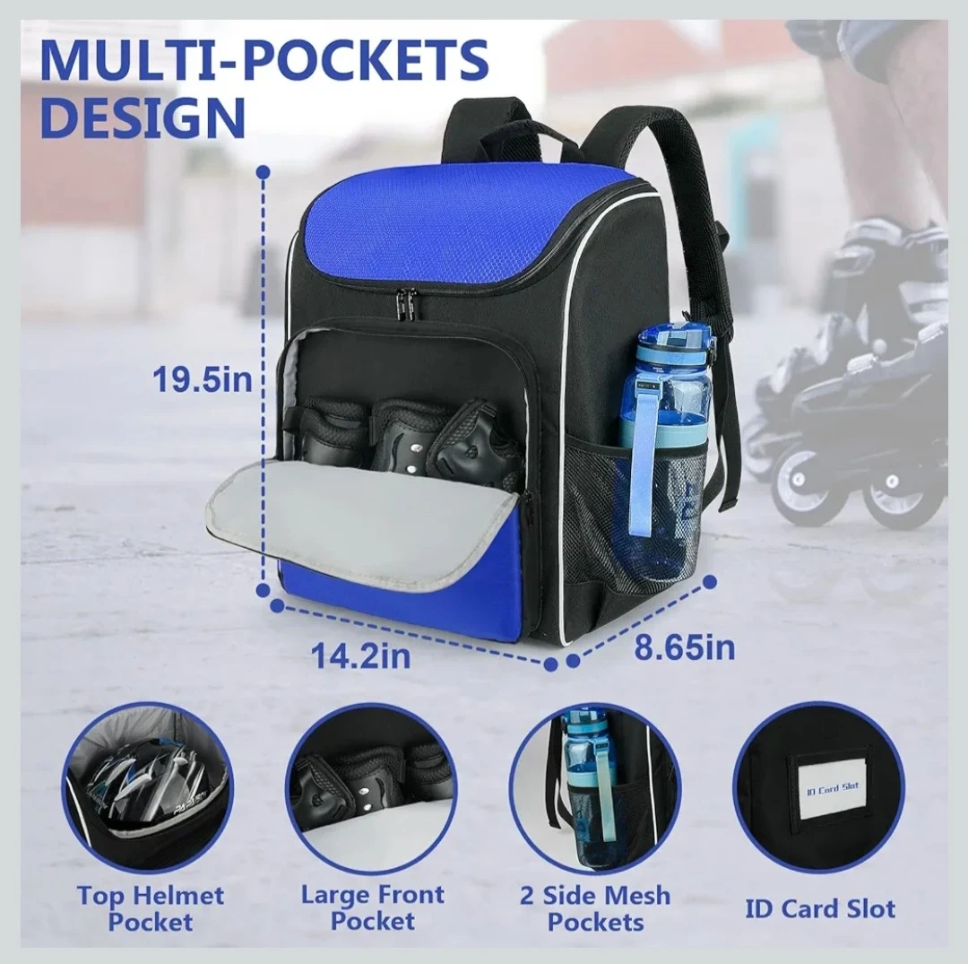 Roller Skate Bag, Ice Skate Backpack Fits Shoes Up to US Men Size 14, Figure Skating Bag with Multi-Pockets for Men, Black&Blue