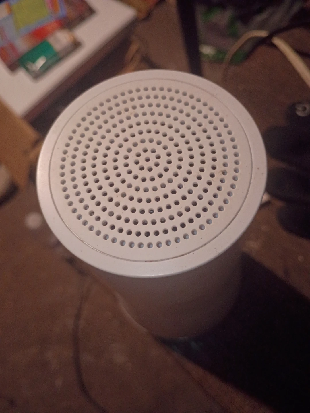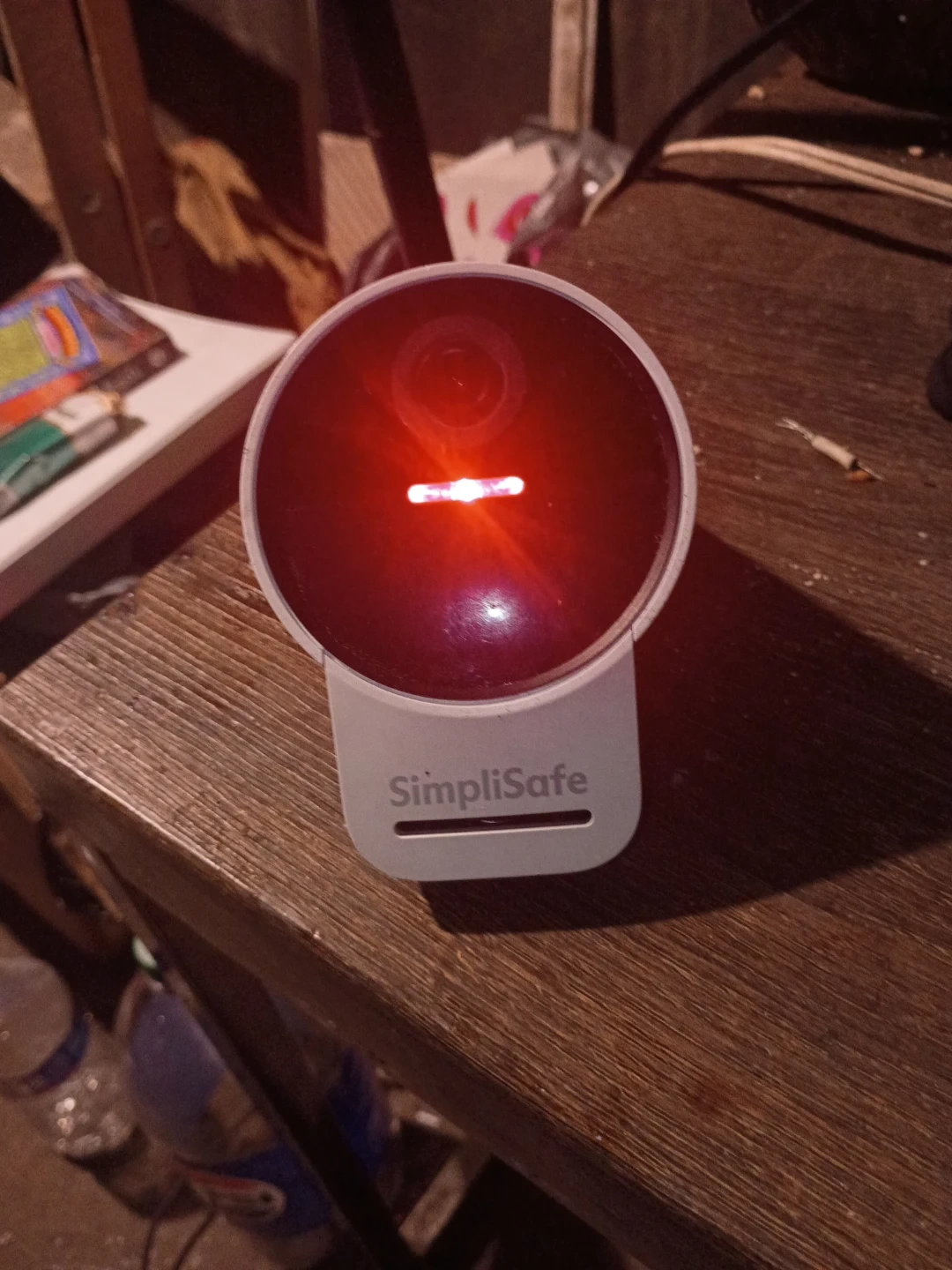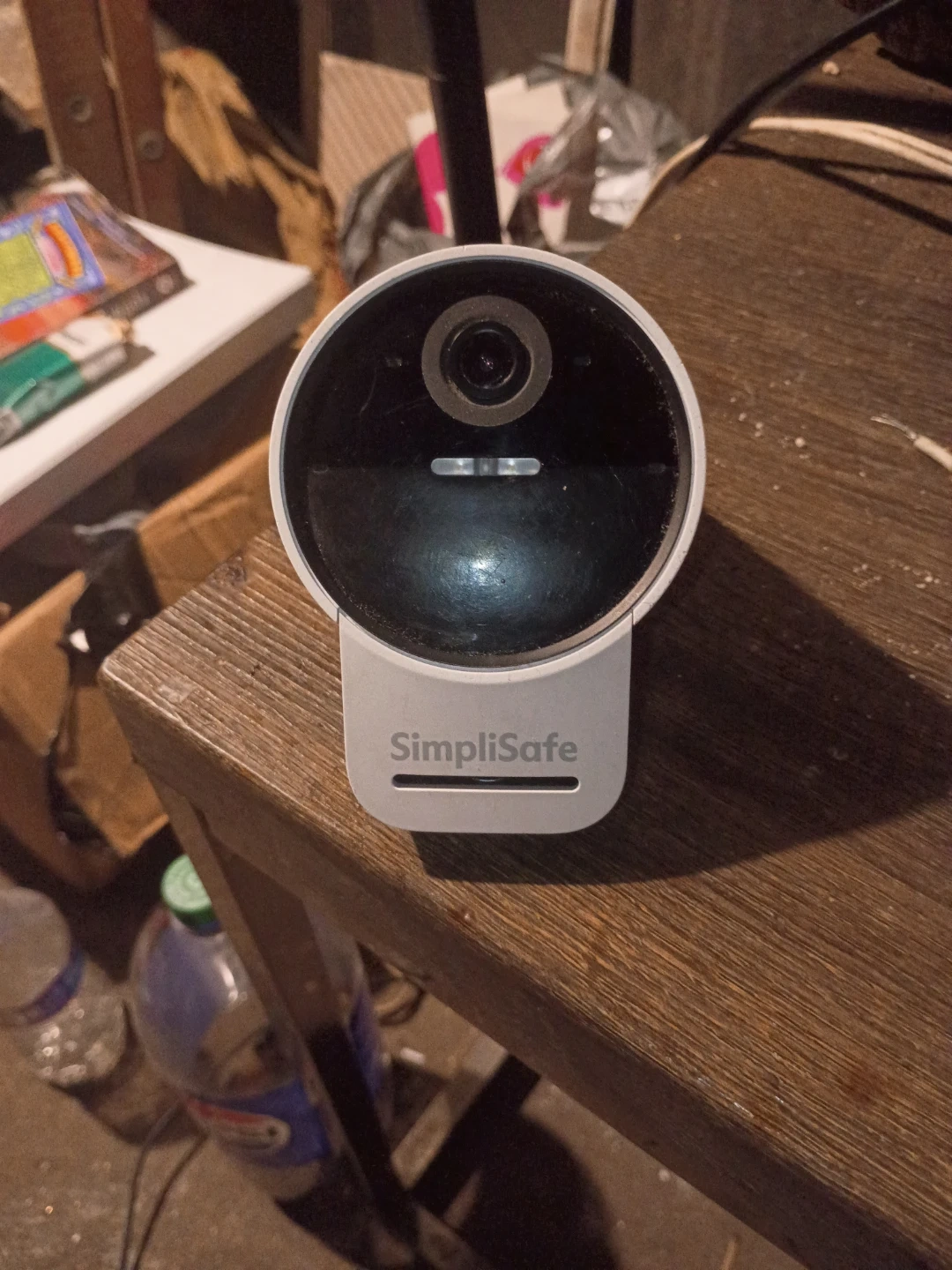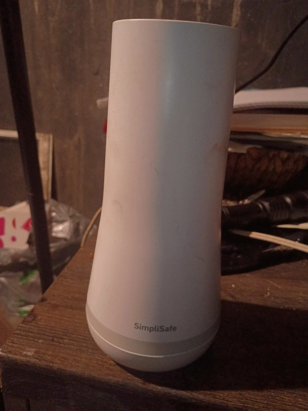 White SimpliSafe indoor security camera. It has a wide-angle lens and motion detection capabilities. Great for keeping an eye on your home's interior.