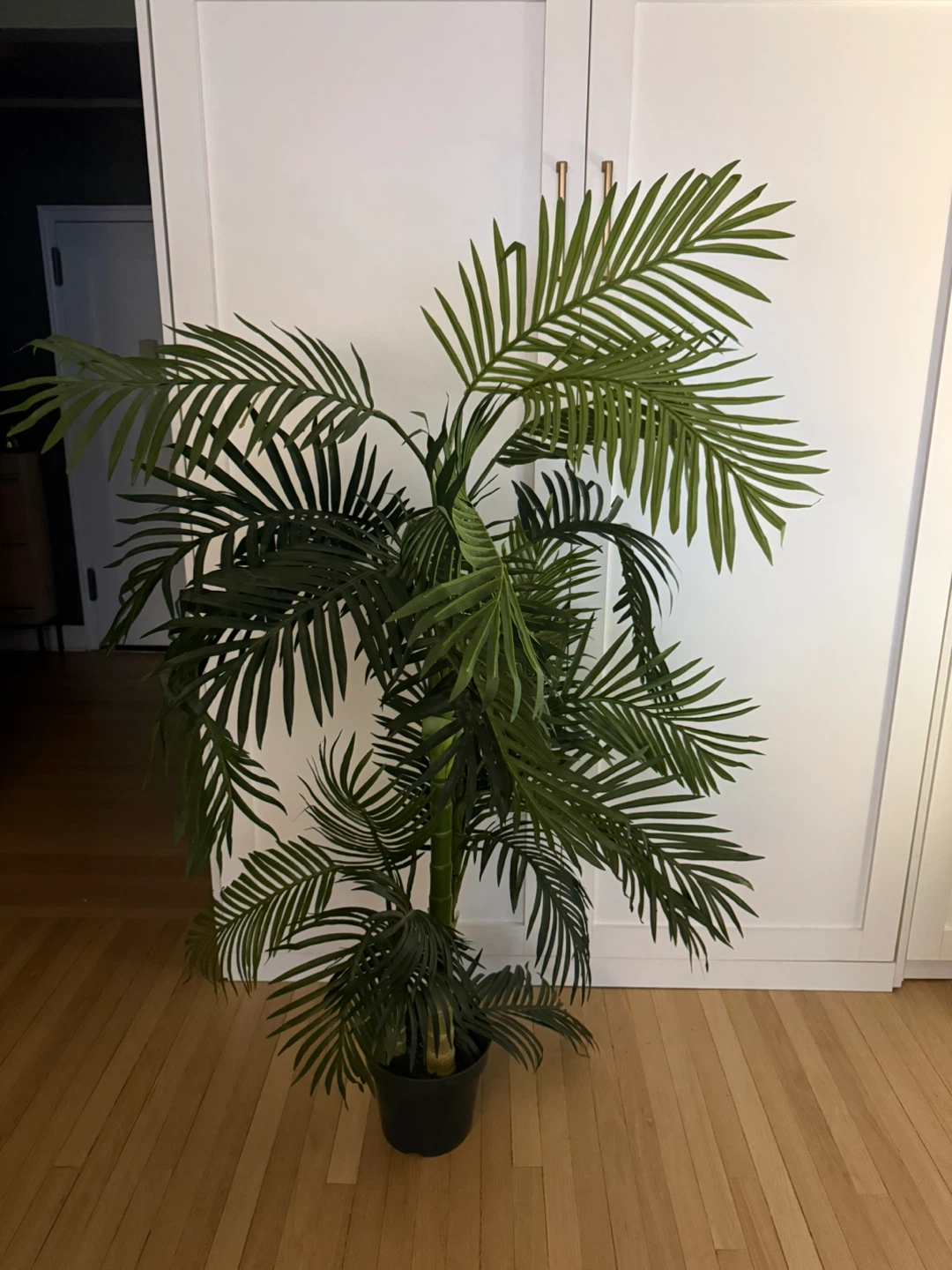 Here's an artificial palm tree that could be a great addition to your home or office space! It adds a touch of greenery without the need for watering or sunlight. It's in great condition and ready to brighten up any room