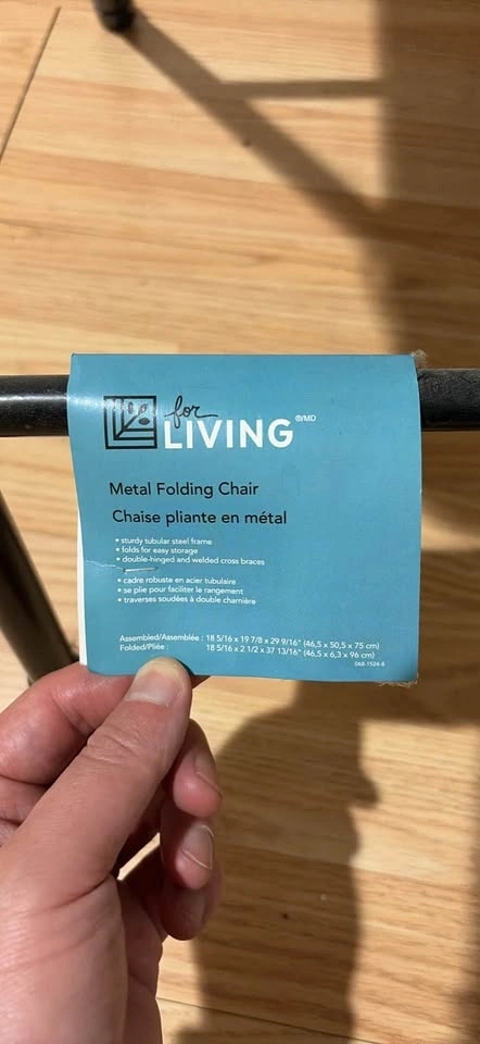 Sturdy black metal folding chair with a tubular steel frame. Folds for easy storage and features double-hinged and welded cross braces. Assembled dimensions: 18 5/16 x 19 7/8 x 29 9/16 inches (46.5 x 50.5 x 75 cm). Folded dimensions: 18 5/16 x 2 1/2 x 37 13/16 inches (46.5 x 6.3 x 96 cm).