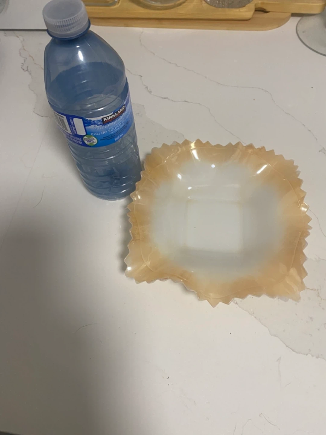 Lovely opalescent glass candy dish with a ruffled edge. It's white with an amber hue on the rim. Glass material. Perfect for serving small treats or as a decorative accent piece!