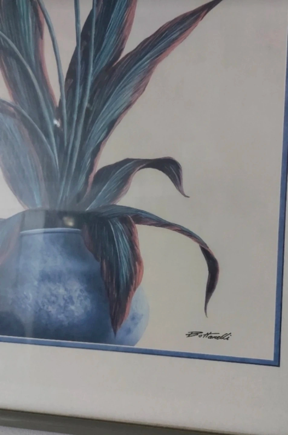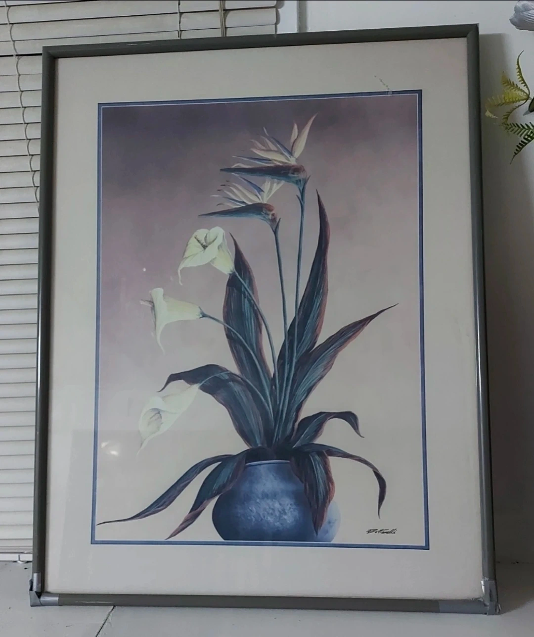 This framed art print features a beautiful depiction of calla lilies and a bird of paradise flower in a blue vase. The artwork is signed "Bottarelli". It's a perfect piece to complement any room.
