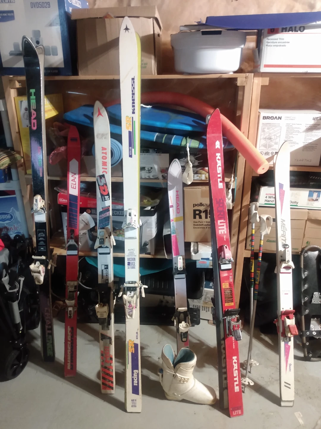 Collection of various ski brands including Head, Elan, Atomic, Kastle, and Merit. Includes one white ski boot. Perfect for recreational skiing.