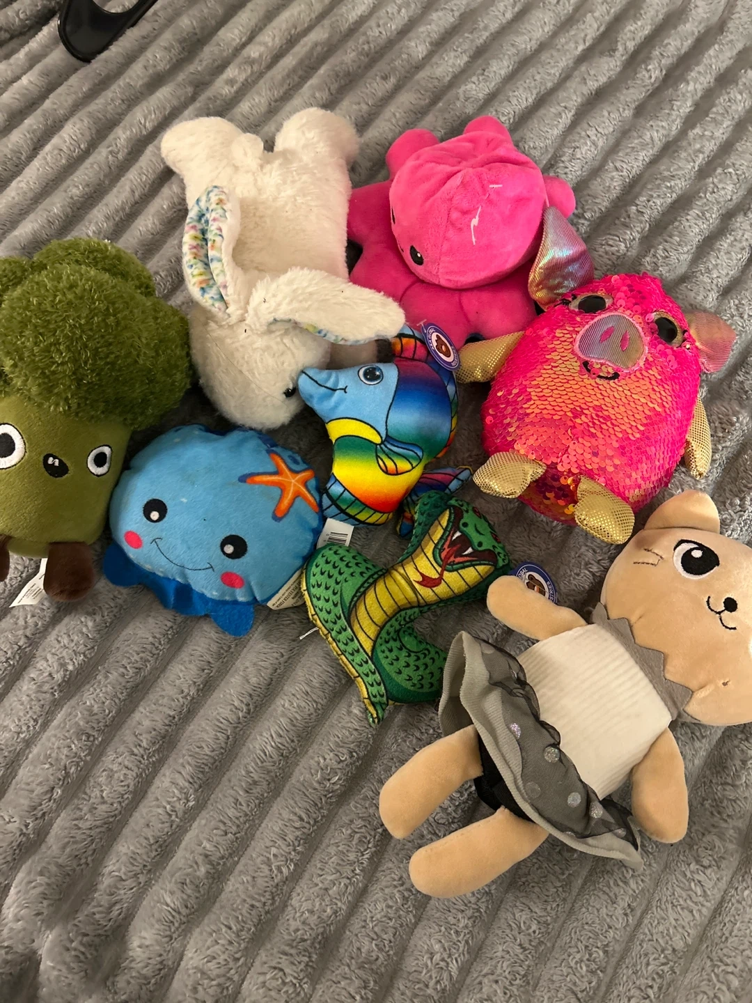 This bundle includes seven different plush toys. It features a broccoli, a white bunny, a blue octopus with a starfish, a rainbow fish, a green snake, a pink pig with sequins, and a beige bear in a dress. These stuffed animals are great for playtime or collecting!