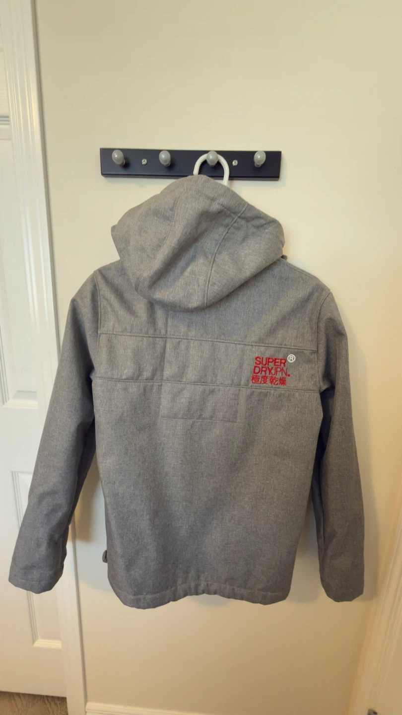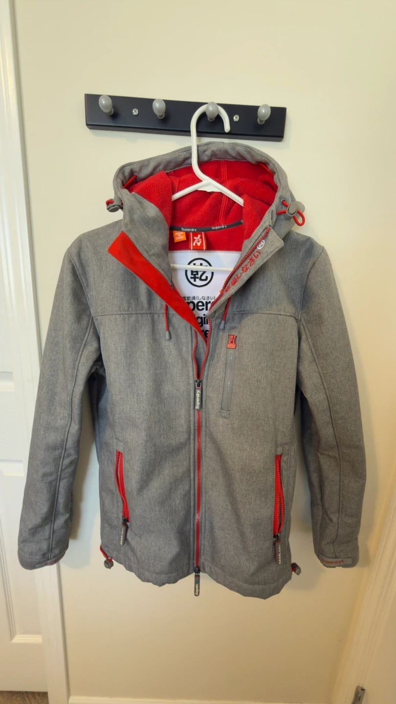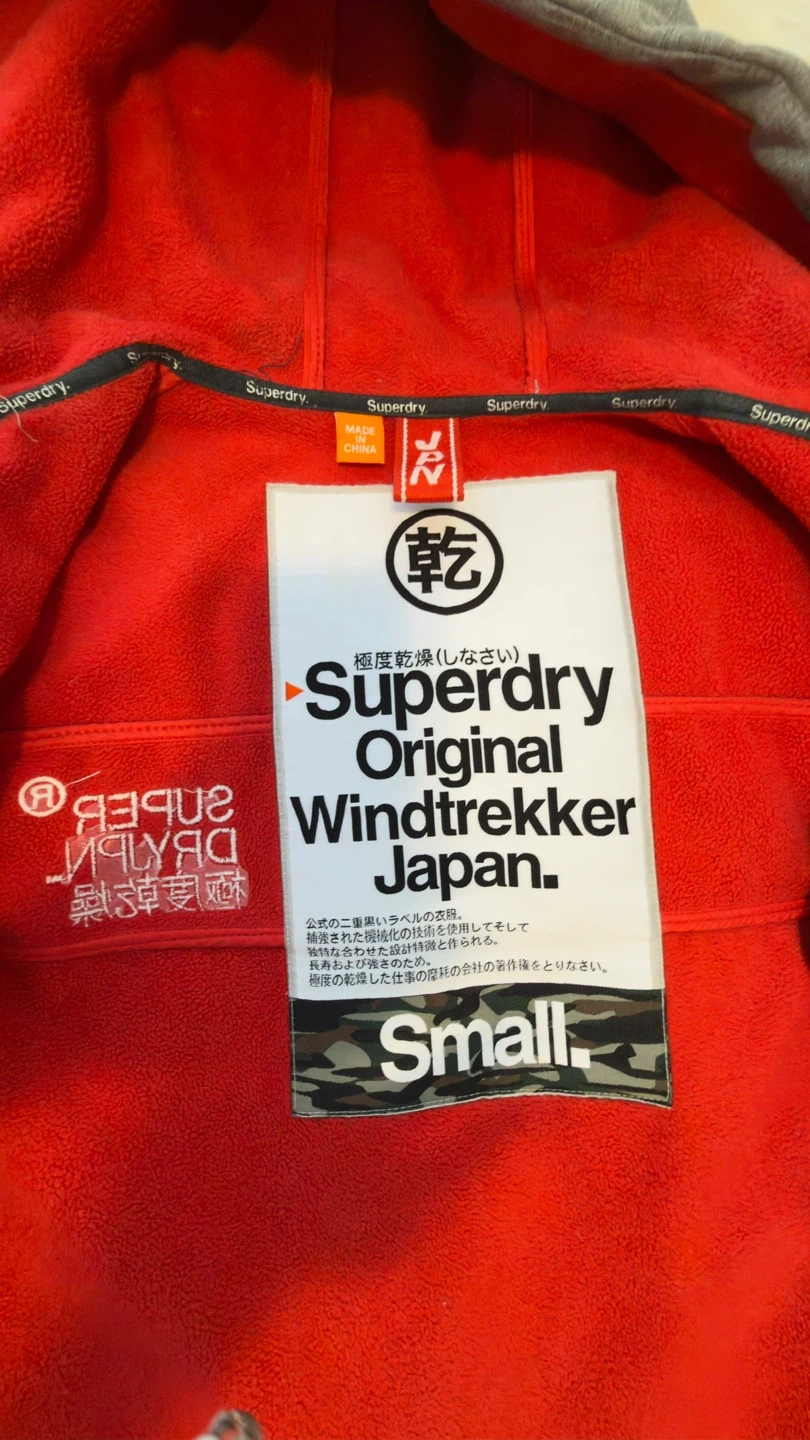 Superdry Original Windtrekker jacket. It's grey with red lining and zippers. Size is small,for unisex good for daily wear cash and pickup only