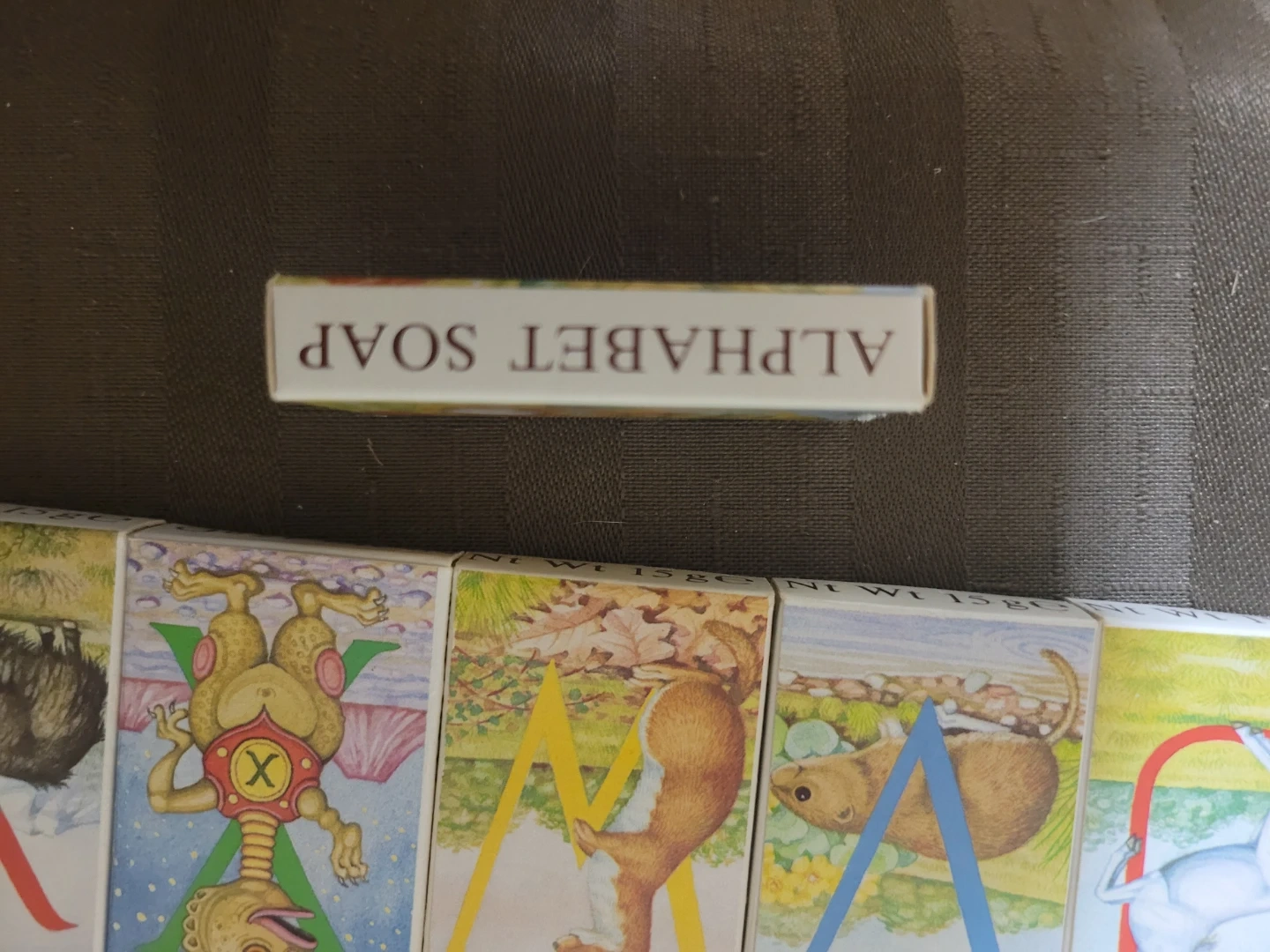 Design: Each soap displays a large letter of the alphabet overlaid on illustrations of corresponding animals and scenes.