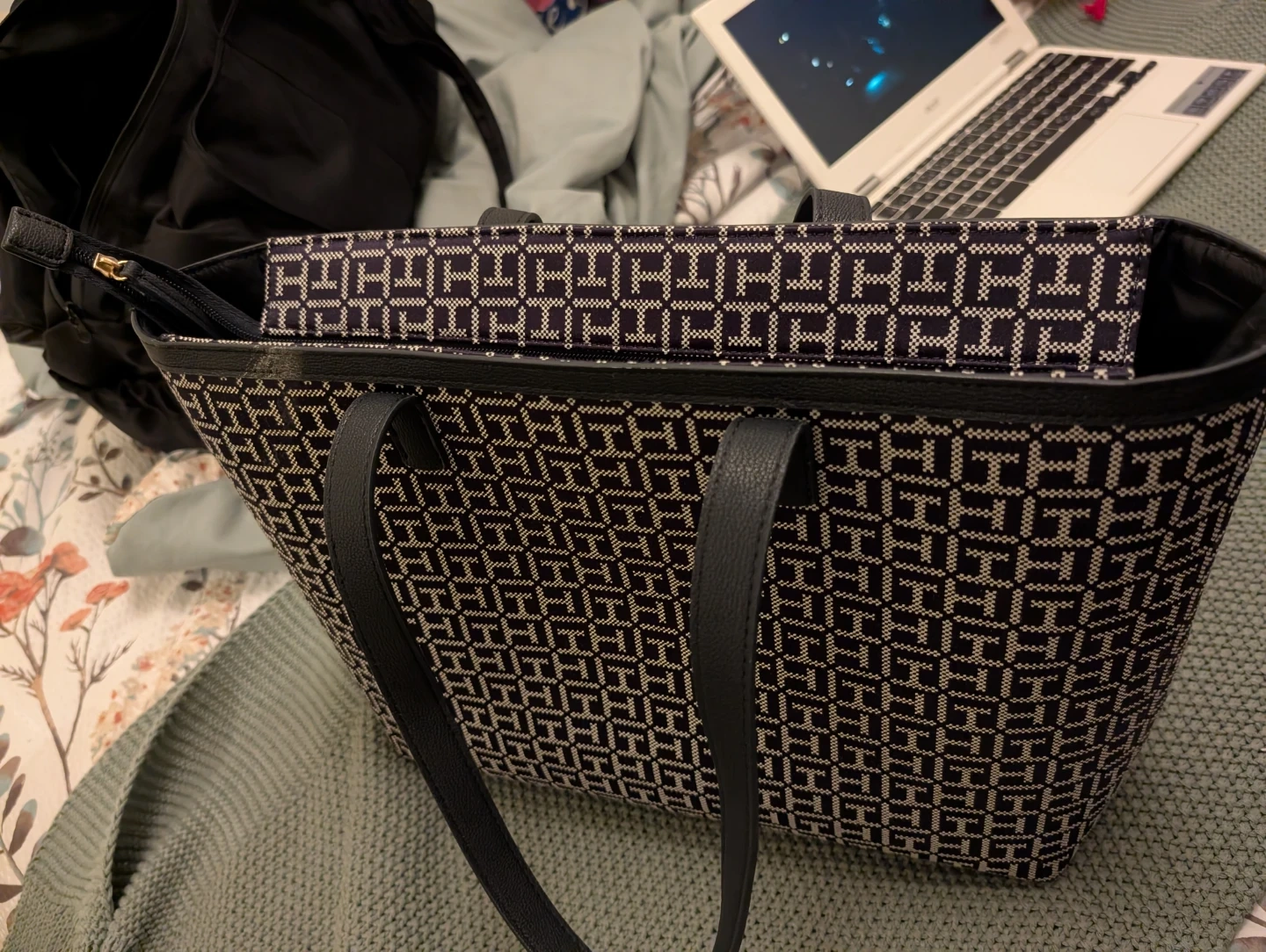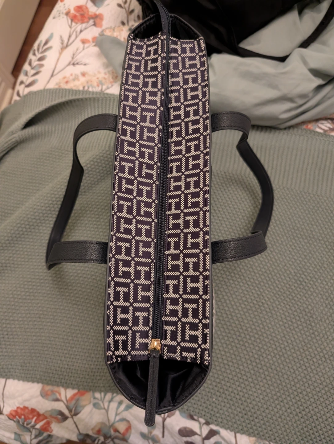 Tommy Hilfiger tote bag with all-over TH monogram pattern. It features a zippered closure and an interior zippered pocket. Leather handles and trim.
