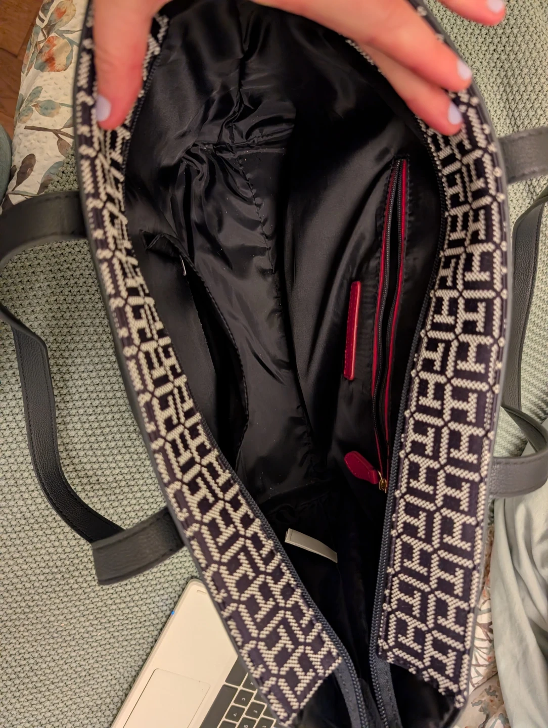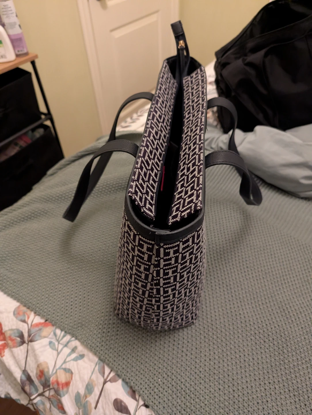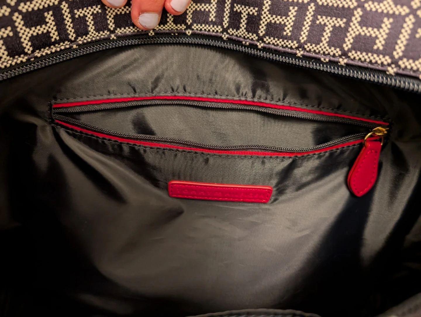 Tommy Hilfiger tote bag with all-over TH monogram pattern. It features a zippered closure and an interior zippered pocket. Leather handles and trim.