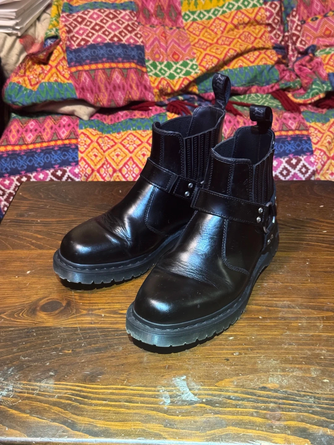 Selling a pair of Dr. Martens black leather Chelsea boots. They feature a stylish strap and buckle design. The boots are in good condition and ready for a new owner. Size US 11M