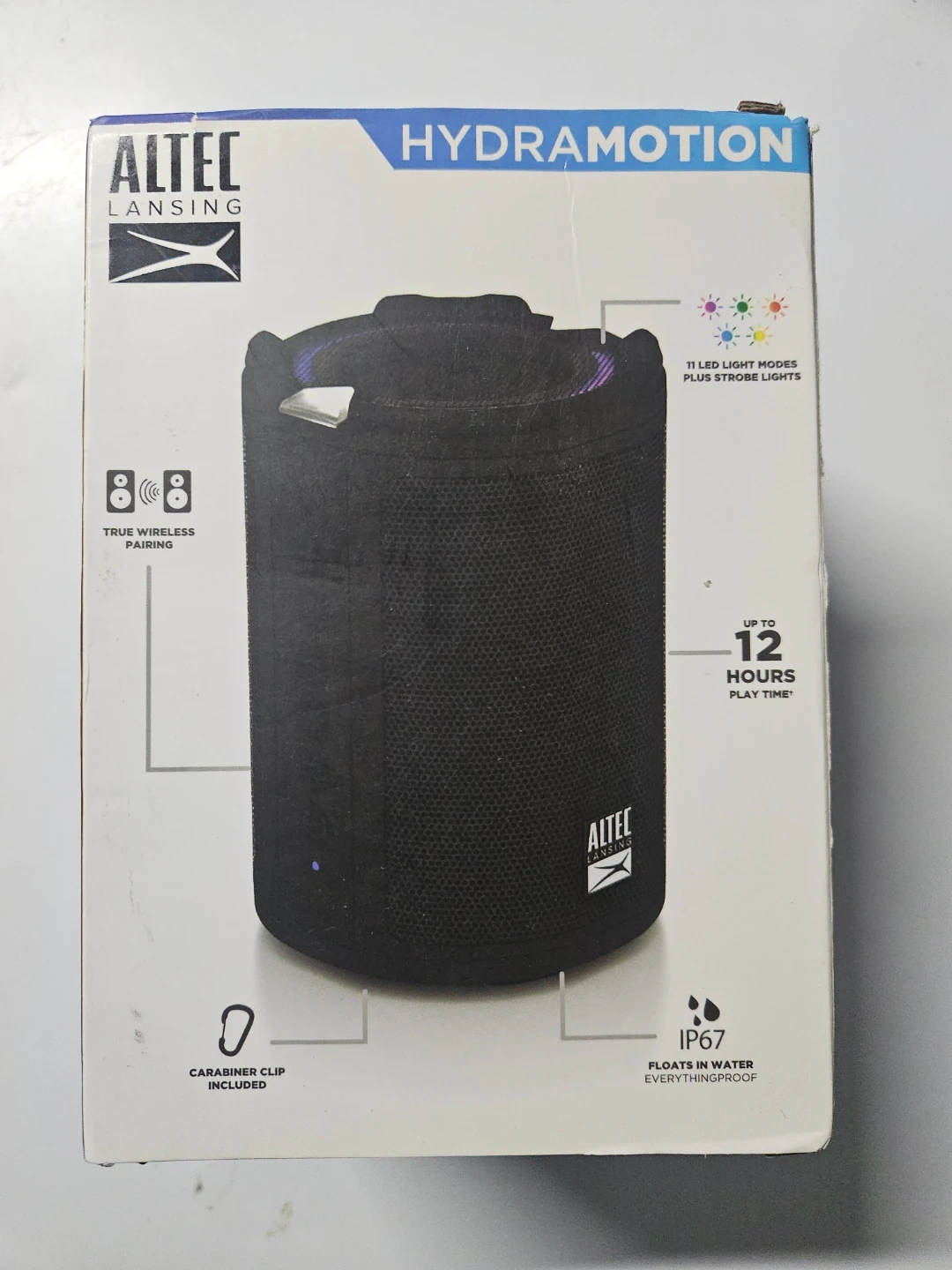 This Altec Lansing speaker offers true wireless pairing and up to 12 hours of playtime. It's IP67 rated, making it floatable and waterproof. Features 11 LED light modes plus strobe lights. A carabiner clip is included.