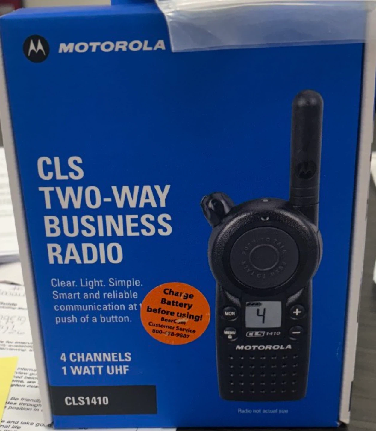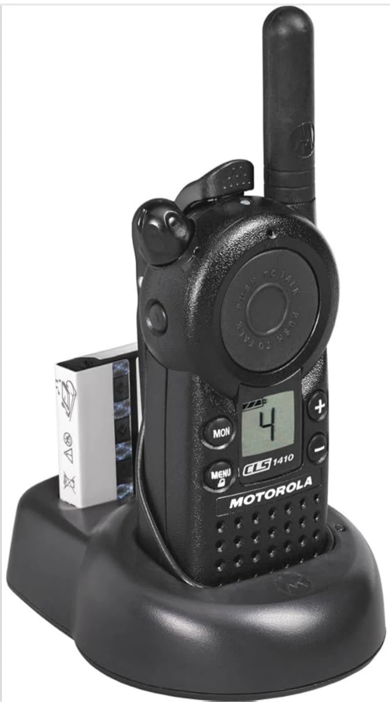 This Motorola CLS 1410 is a two-way business radio. It's a 4-channel, 1 Watt UHF radio. It comes with a charger and belt clip.