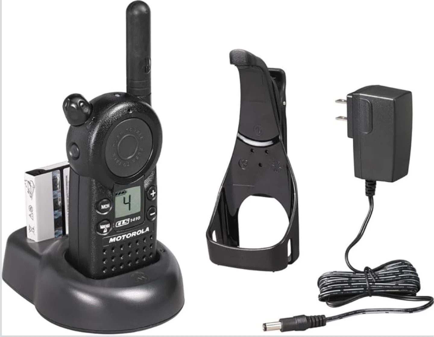 This Motorola CLS 1410 is a two-way business radio. It's a 4-channel, 1 Watt UHF radio. It comes with a charger and belt clip.