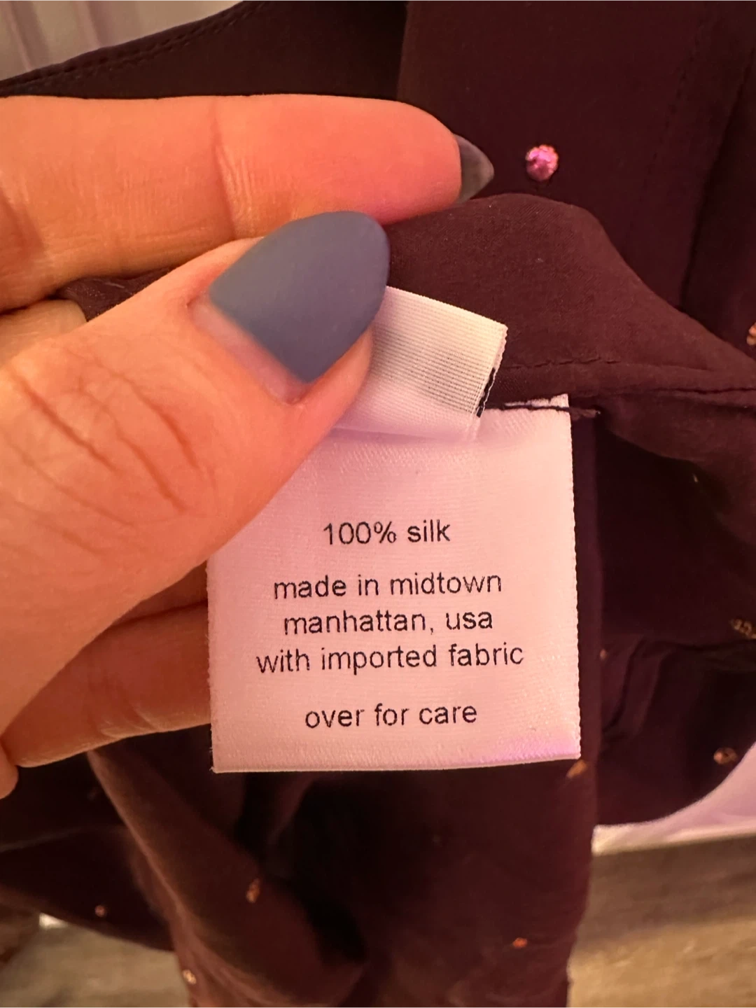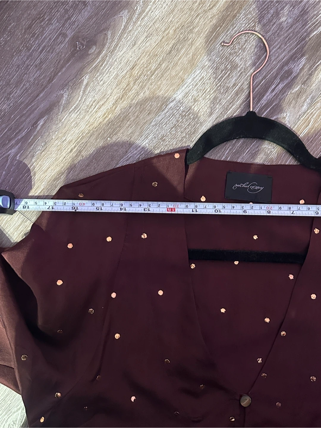 This Rachel Comey blouse is made from 100% silk and features a deep V-neck with button closure. It's adorned with small gold embellishments throughout. Care instructions: hand wash cold, no bleach, lay flat to dry, or dry clean.