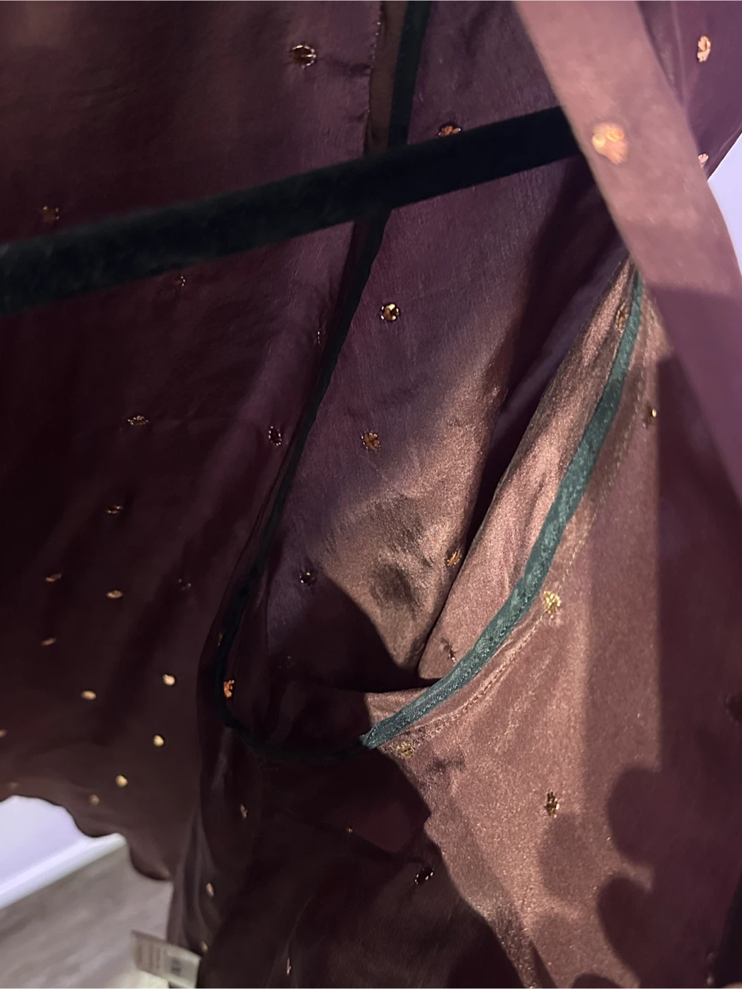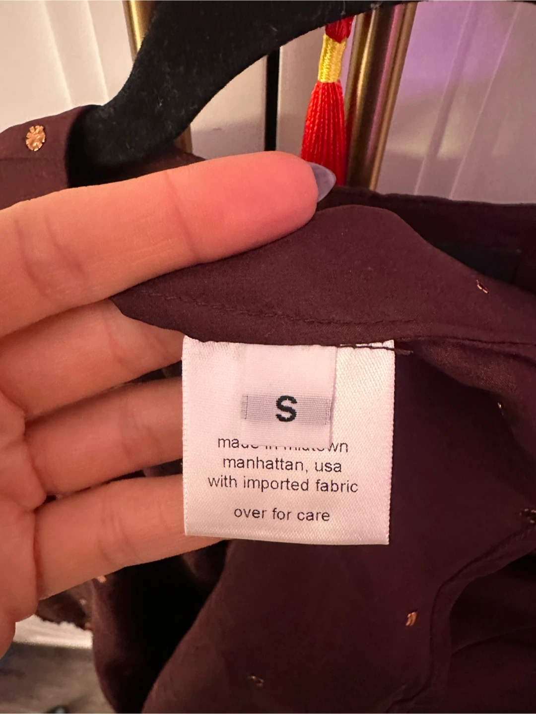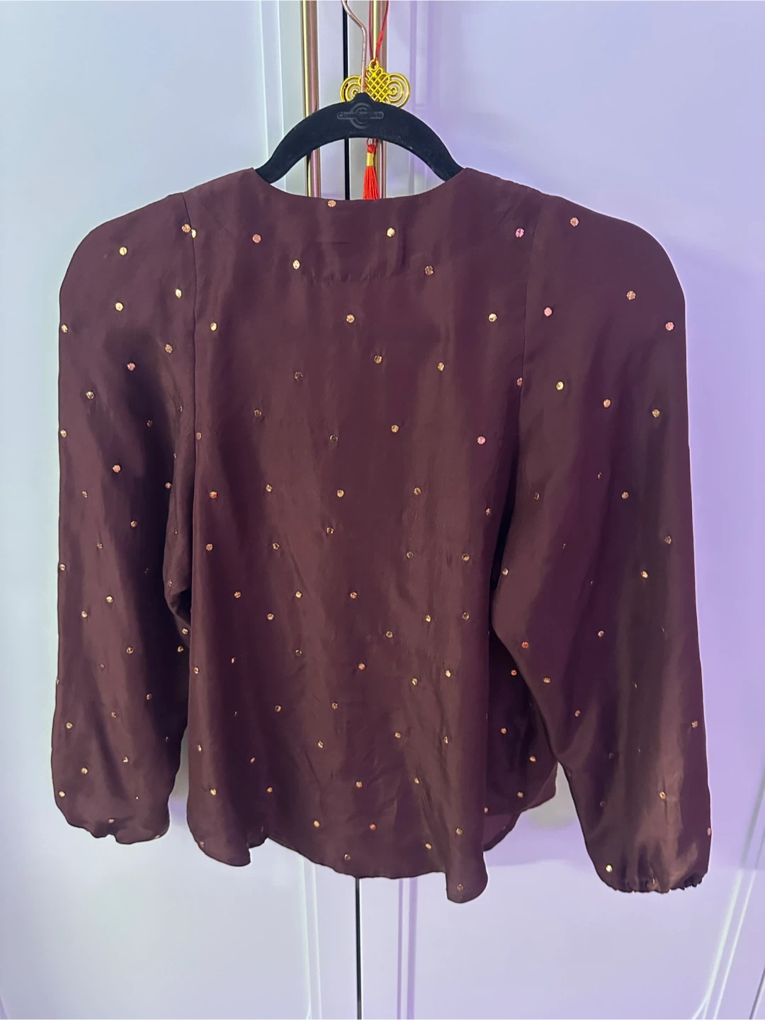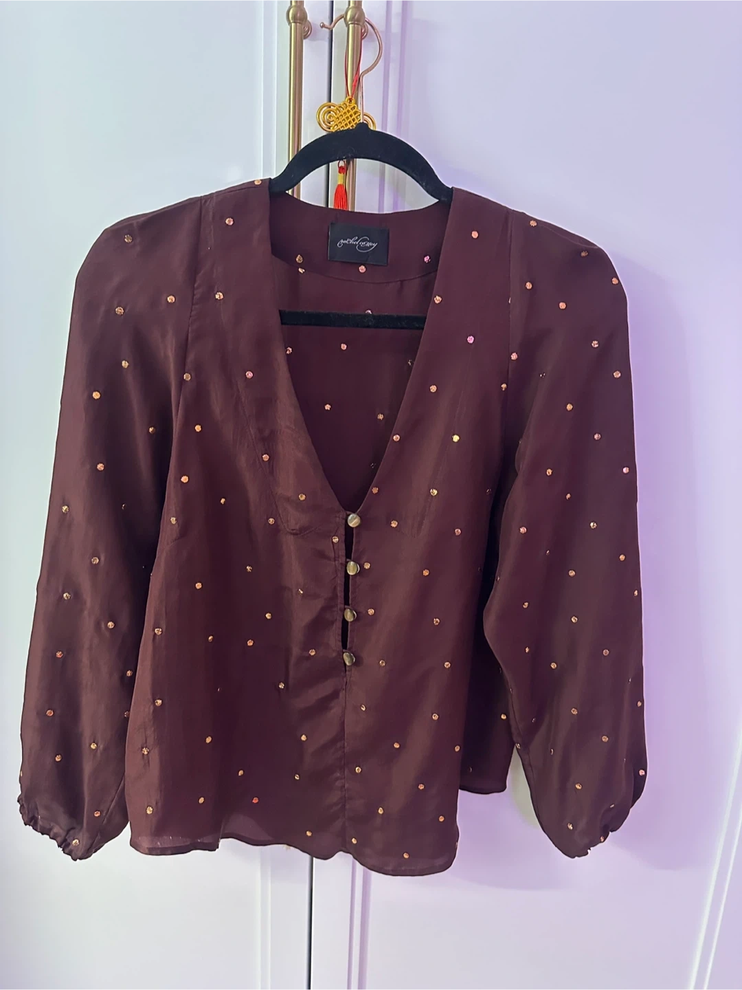 This Rachel Comey blouse is made from 100% silk and features a deep V-neck with button closure. It's adorned with small gold embellishments throughout. Care instructions: hand wash cold, no bleach, lay flat to dry, or dry clean.