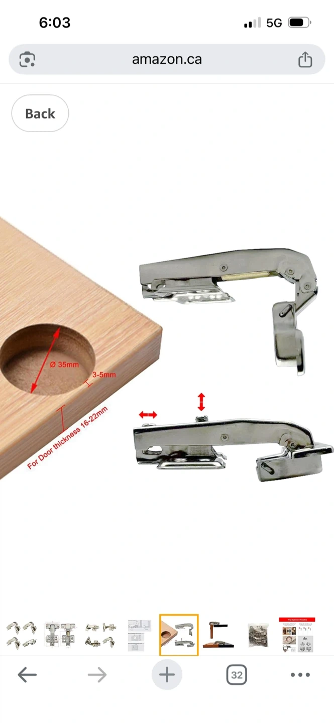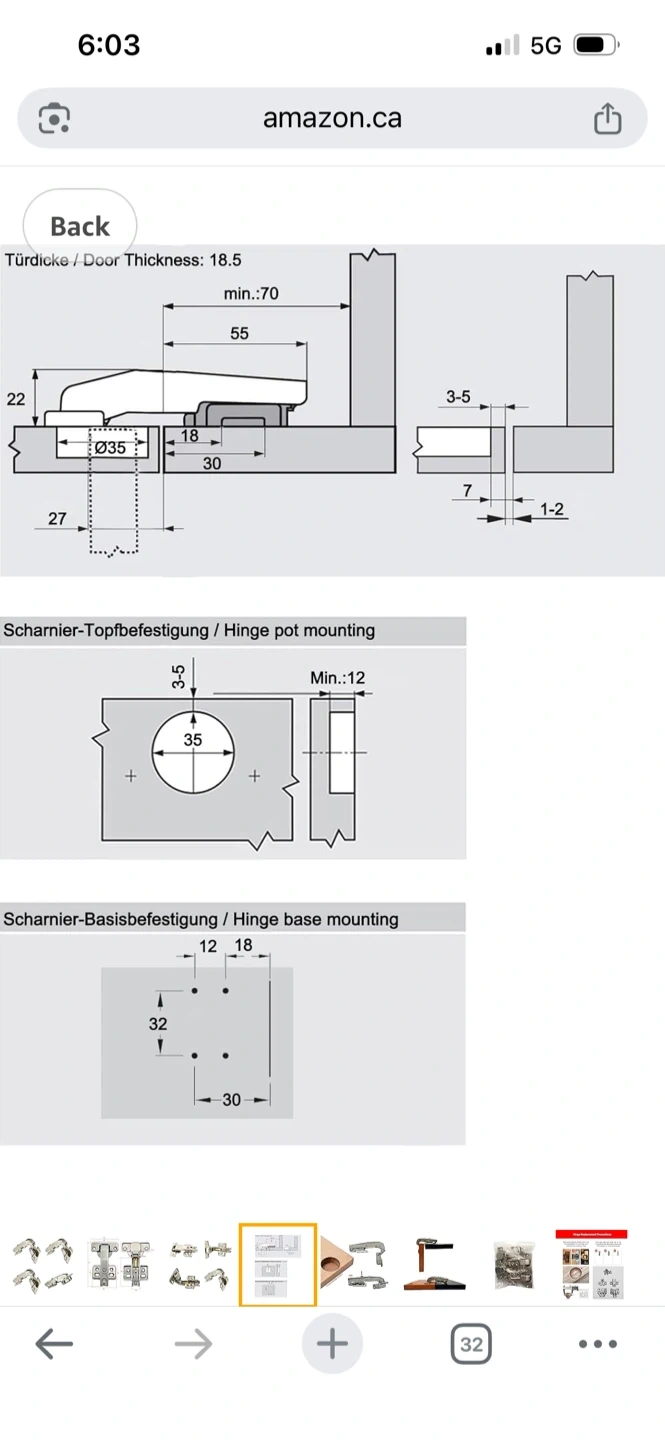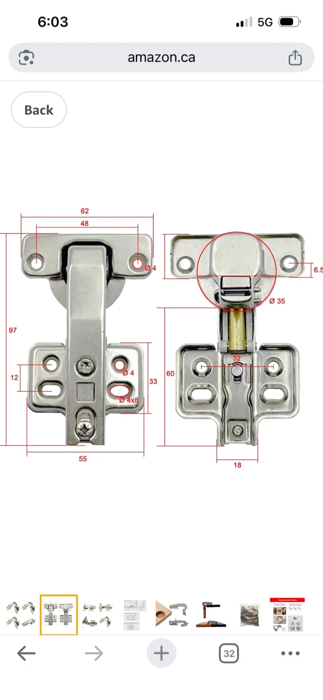 Includes four cabinet hinges. These are overlay hinges for cabinet doors. Door thickness range 16-22mm. Hinge cup diameter 35mm.