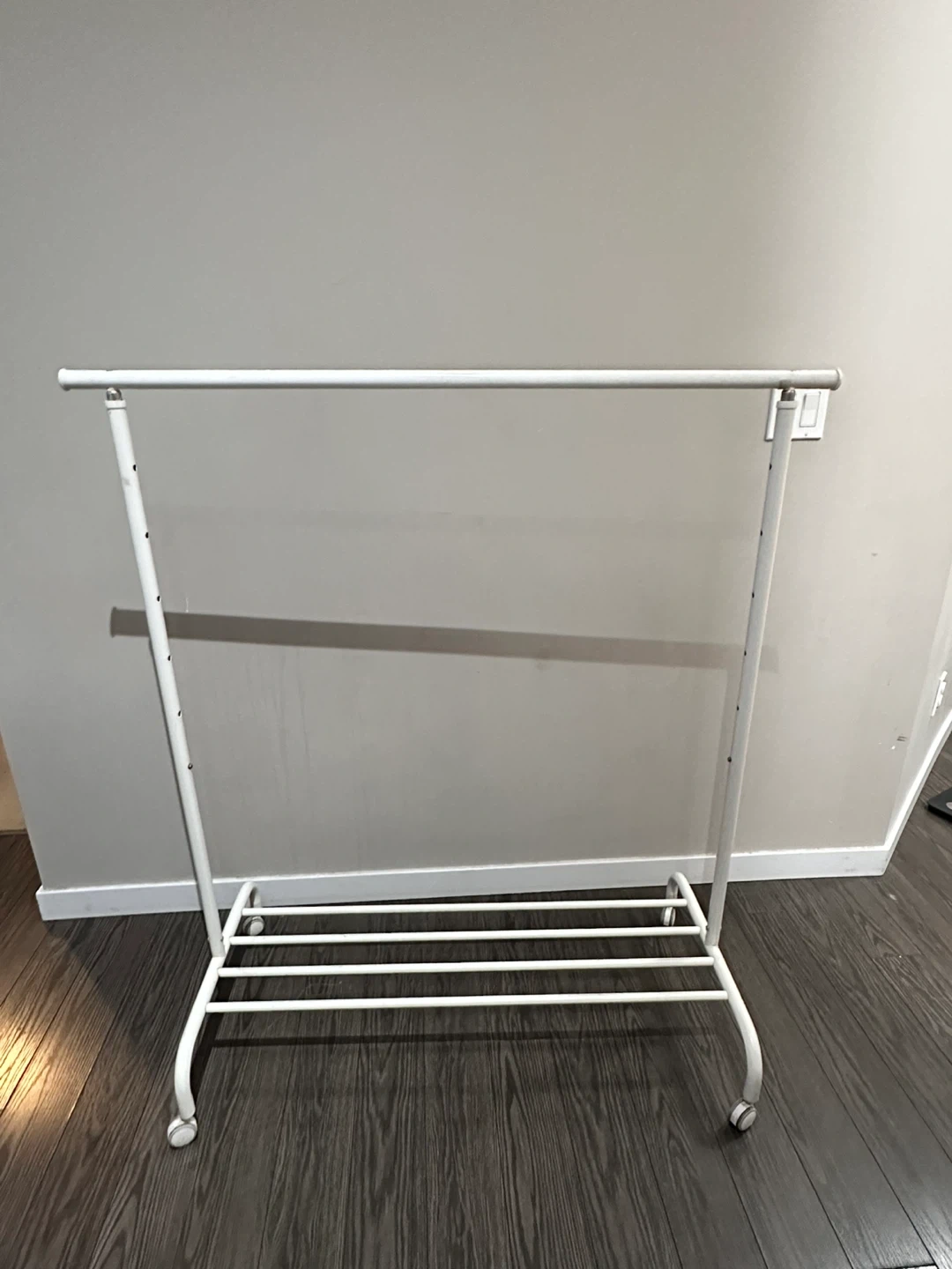 This white metal garment rack is perfect for hanging clothes. It's got a lower shelf for shoes or storage. Rolls easily on wheels!