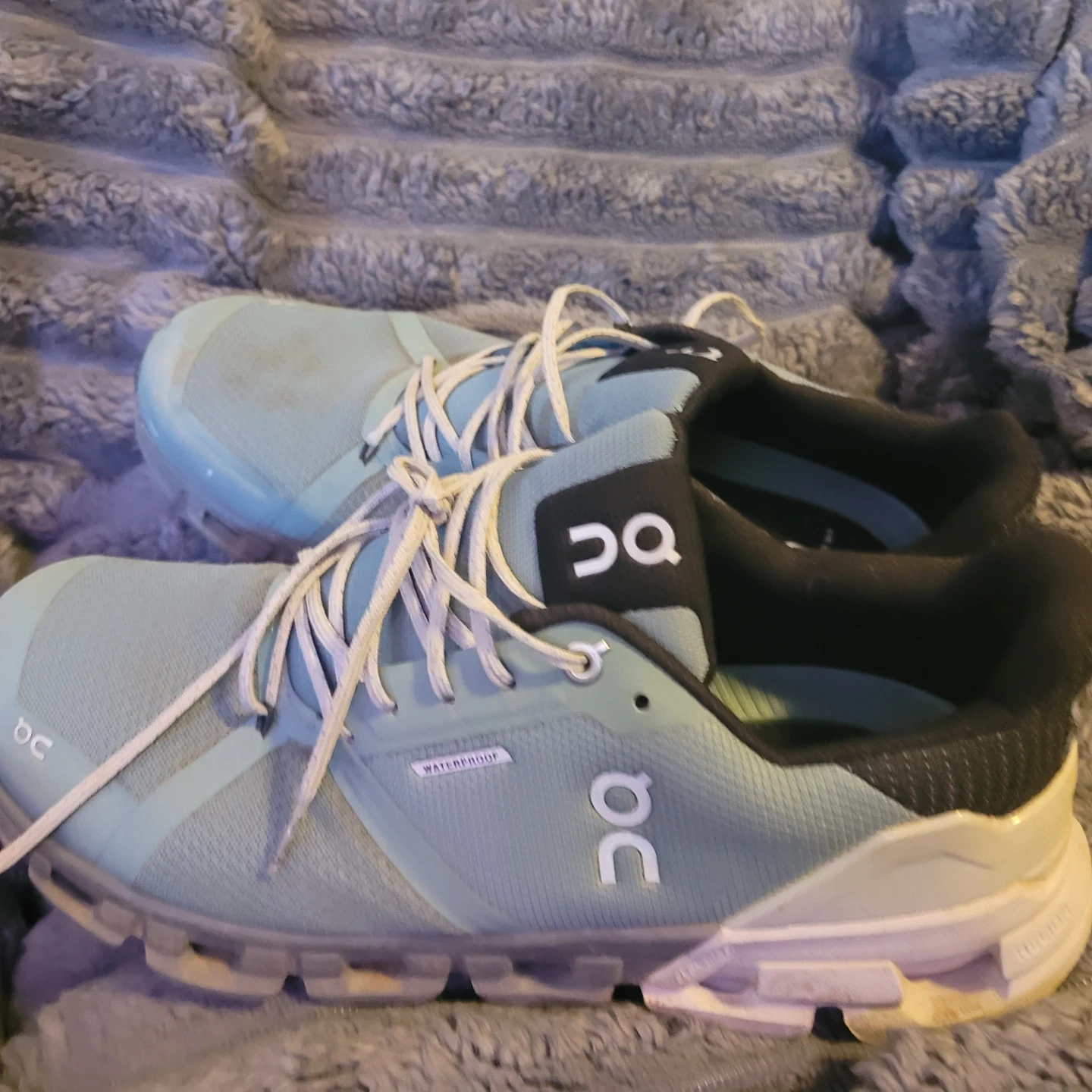 Mens On Cloudflyer WP running shoes in a light blue colour. They're labelled as US M9, EUR 42.5, UK 8.5. The shoes appear to be waterproof. Could use a wash