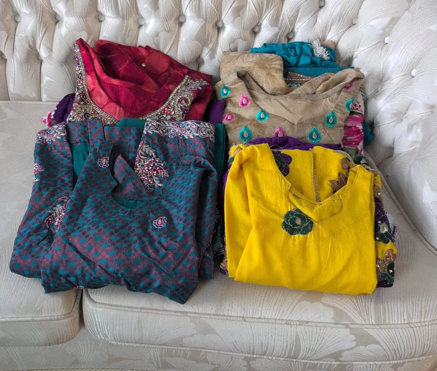 Four colourful embroidered shalwar kameez tops in various styles and colours. Includes red, yellow, teal, and beige options with intricate beadwork and embroidery. These would be great for cultural events or everyday wear!