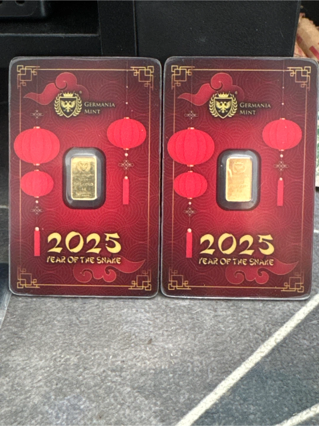 1 gram gold bars from Germania Mint, featuring the Year of the Snake design for 2025. Each bar is made of .9999 fine gold. These are collectible bars minted for the Lunar Year.