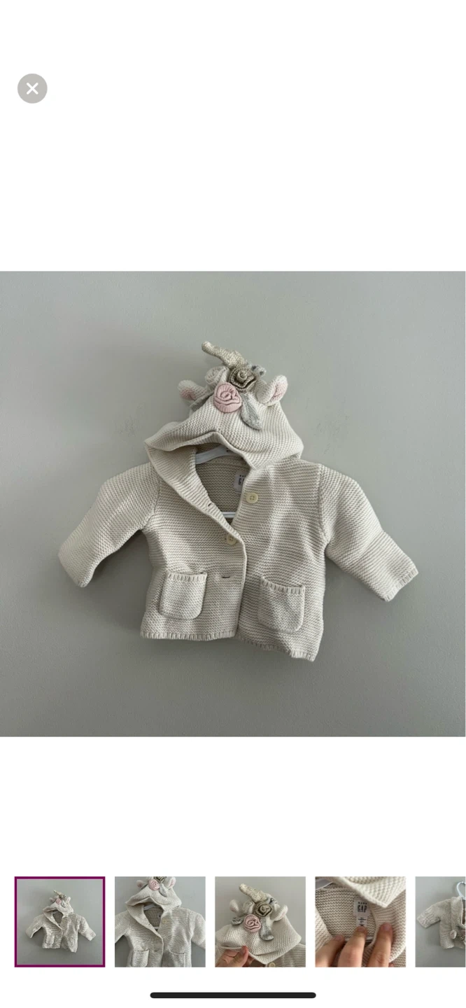 Gap brand. Button up hooded knit cardigan. Unicorn themed hood. Size 0/6m. Brand new condition $8