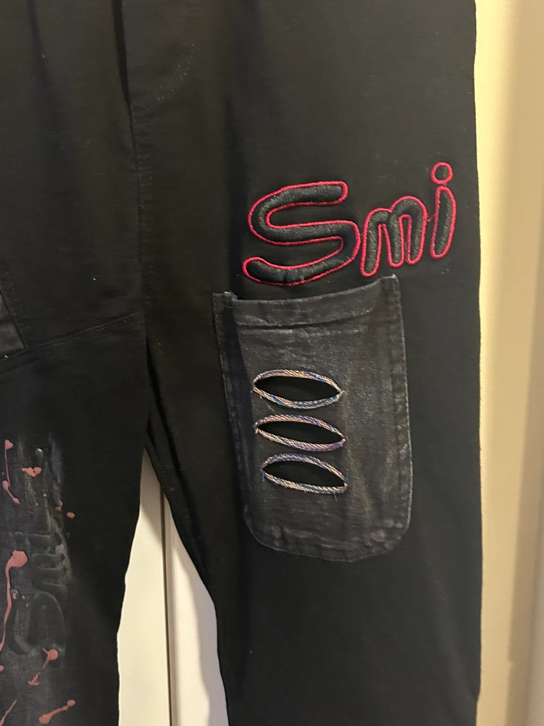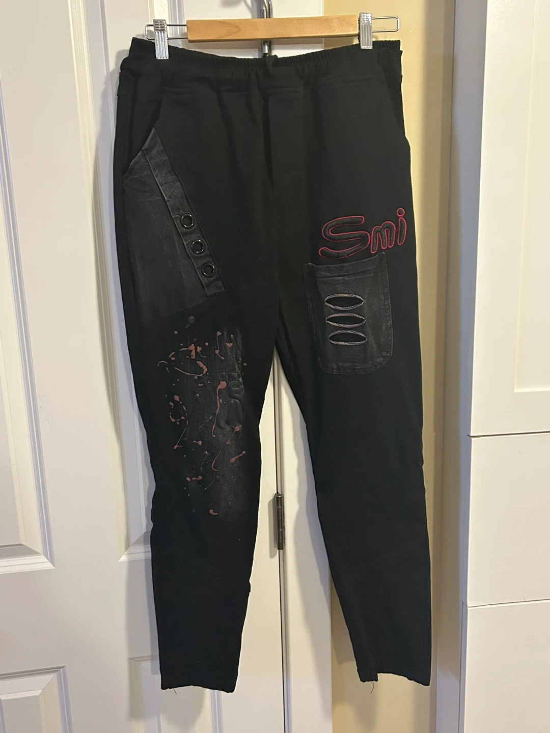 Black pants featuring a unique paint splatter design on one leg and decorative buttons. These pants have an elastic waistband and a casual fit. They're a stylish choice for adding some flair to your wardrobe!