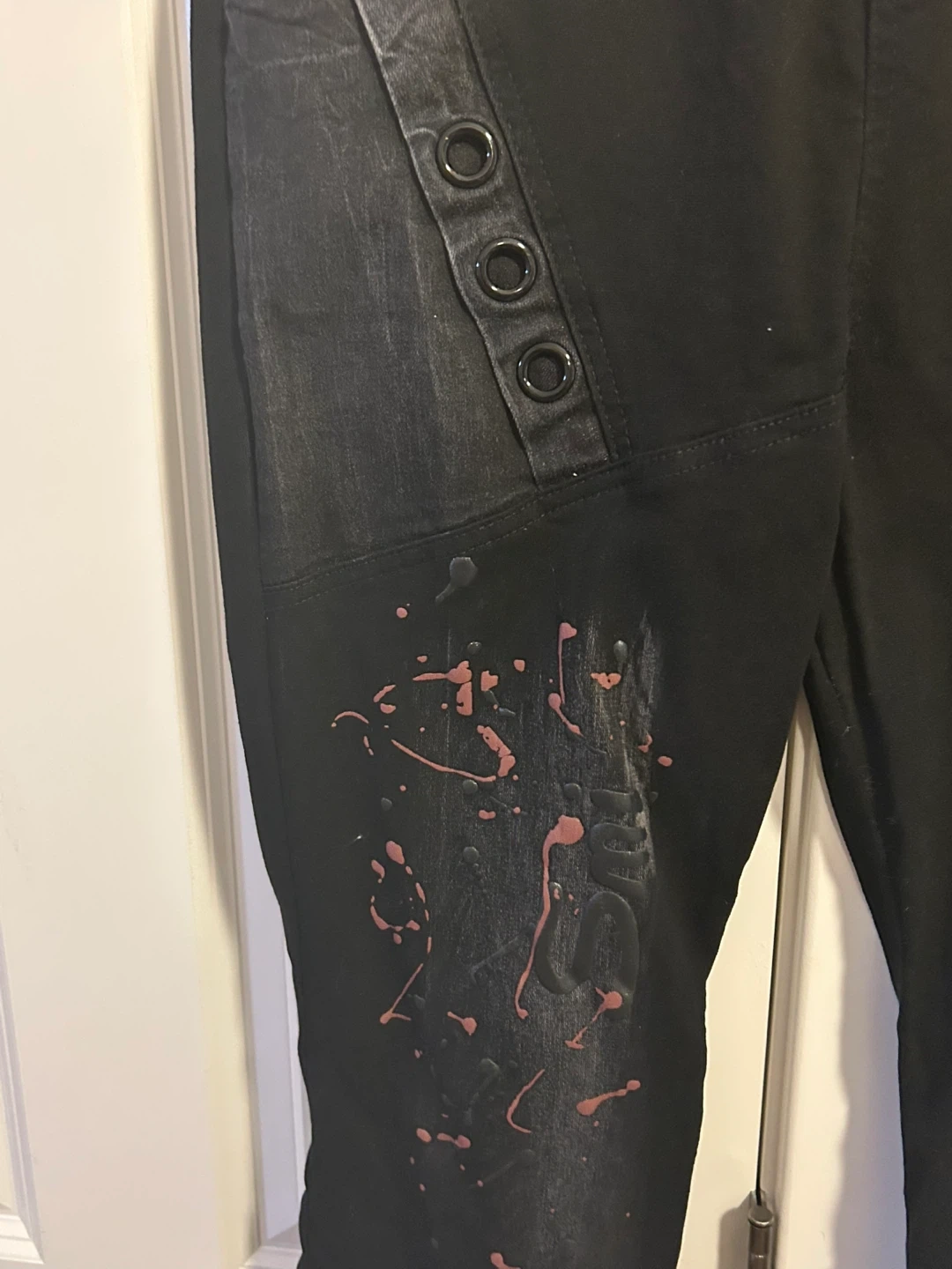 Black pants featuring a unique paint splatter design on one leg and decorative buttons. These pants have an elastic waistband and a casual fit. They're a stylish choice for adding some flair to your wardrobe!