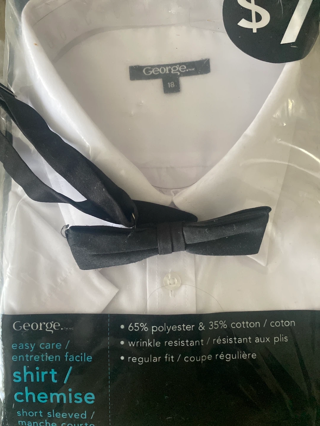 George dress shirt and bow TIE SET. It's white and short-sleeved. 65% polyester and 35% cotton blend, with a regular fit. Wrinkle resistant fabric for easy care.
