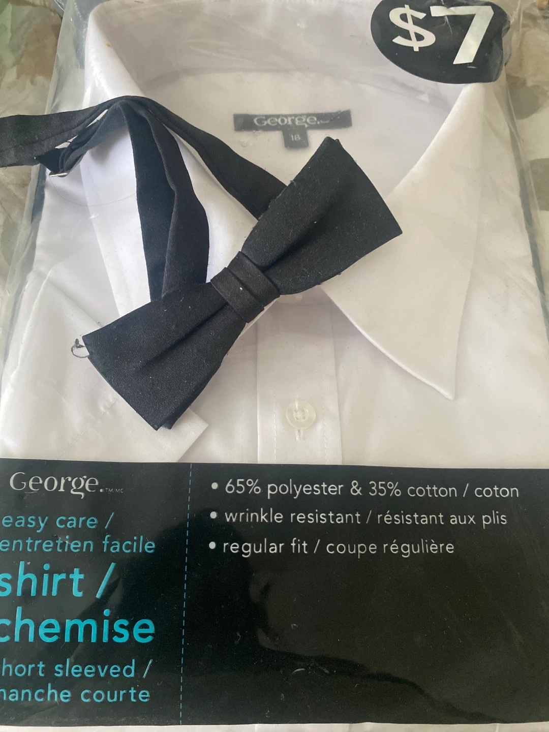 George dress shirt and bow TIE SET. It's white and short-sleeved. 65% polyester and 35% cotton blend, with a regular fit. Wrinkle resistant fabric for easy care.