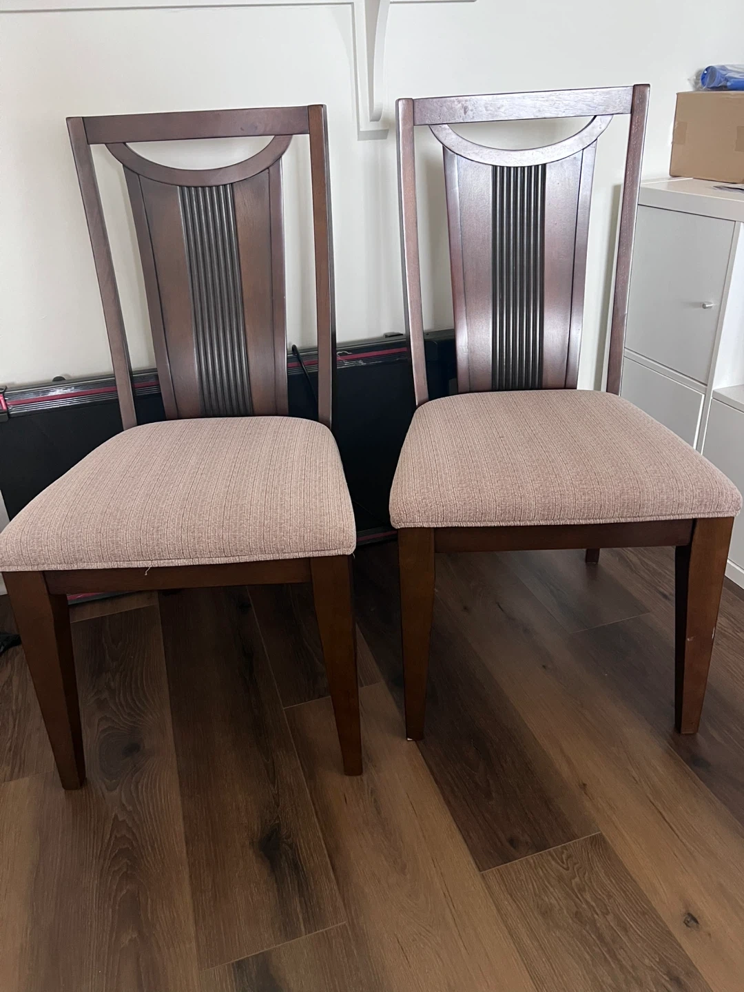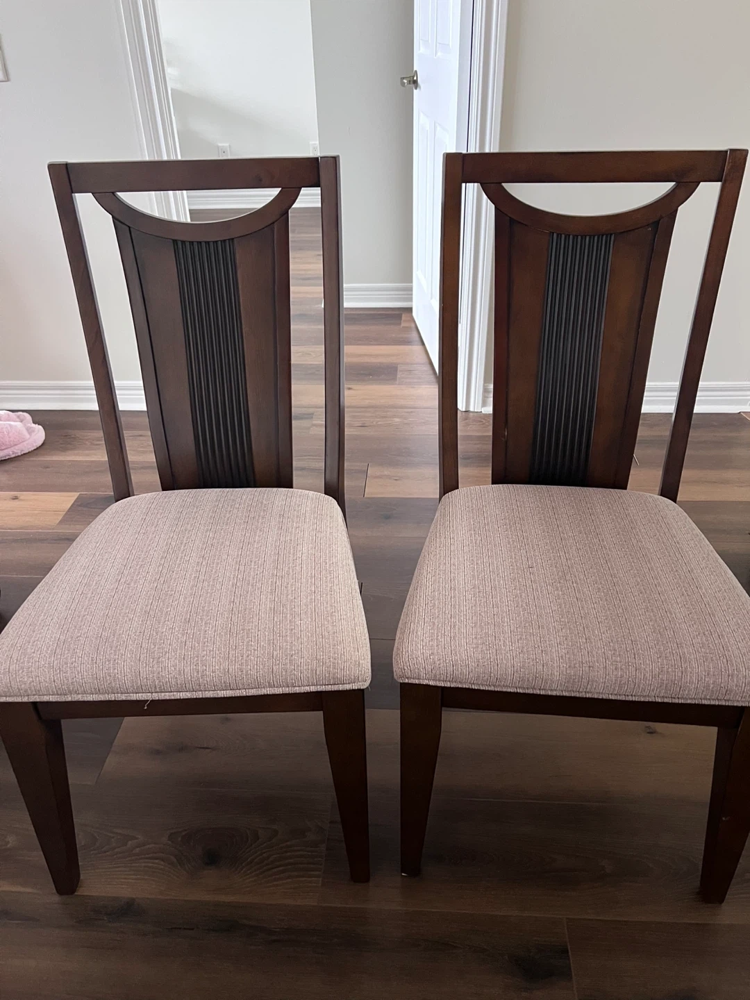 These dining chairs feature a rich brown wood frame and upholstered seats in a neutral fabric. They're comfortable and sturdy for everyday use. Their classic design fits well with many dining room styles.