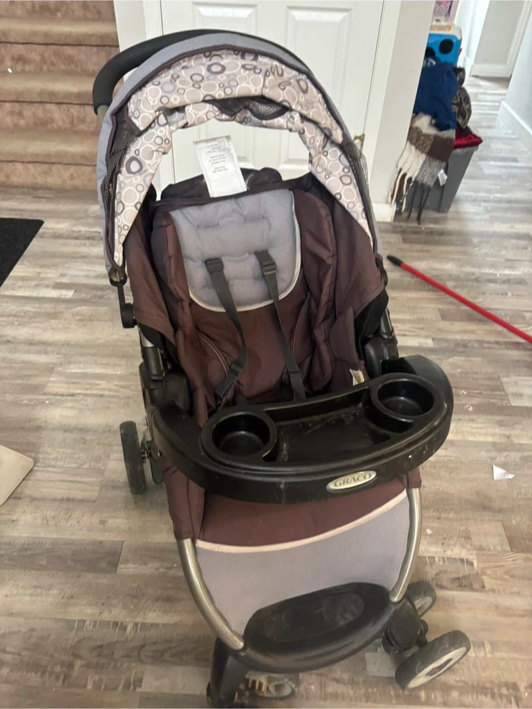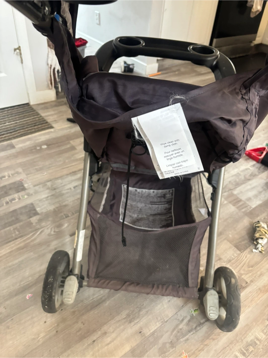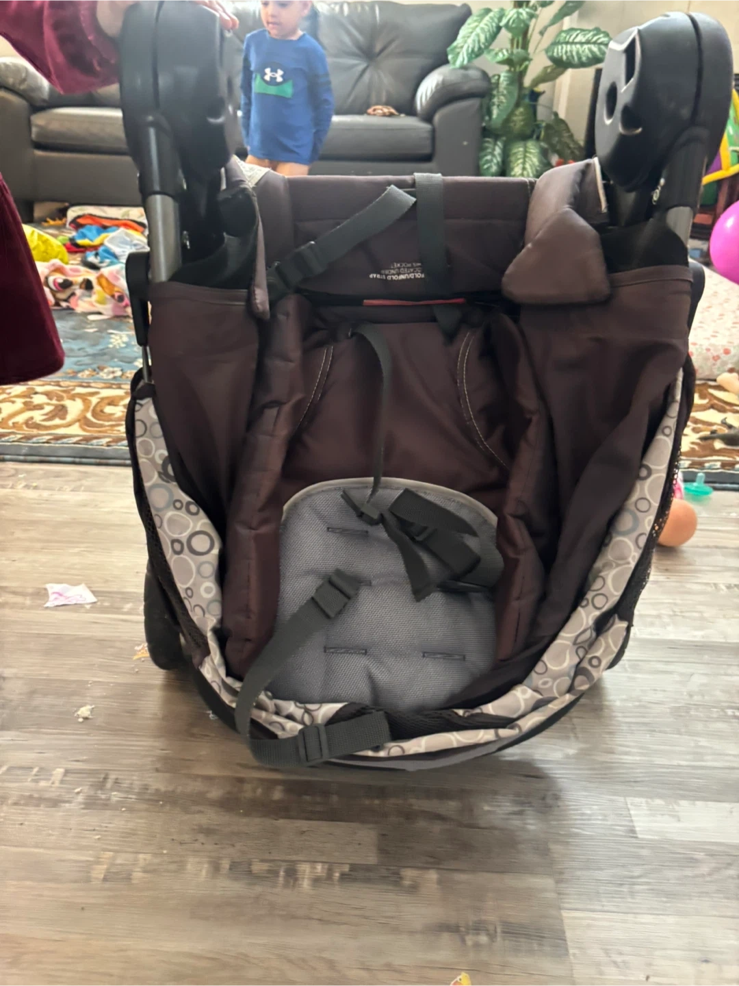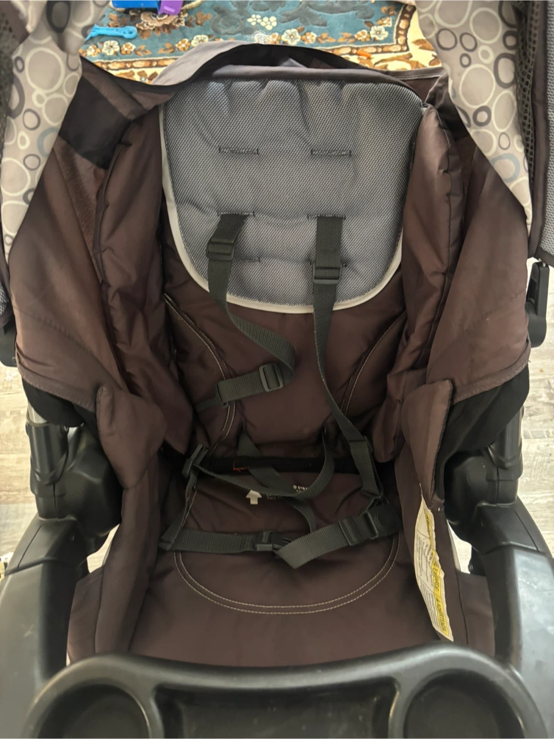 This brown stroller has a 5-point harness for safety. Best for travel easy to fold and taking little space in car compact stroller best for travel. Just need little cleaning , no damage and tear.