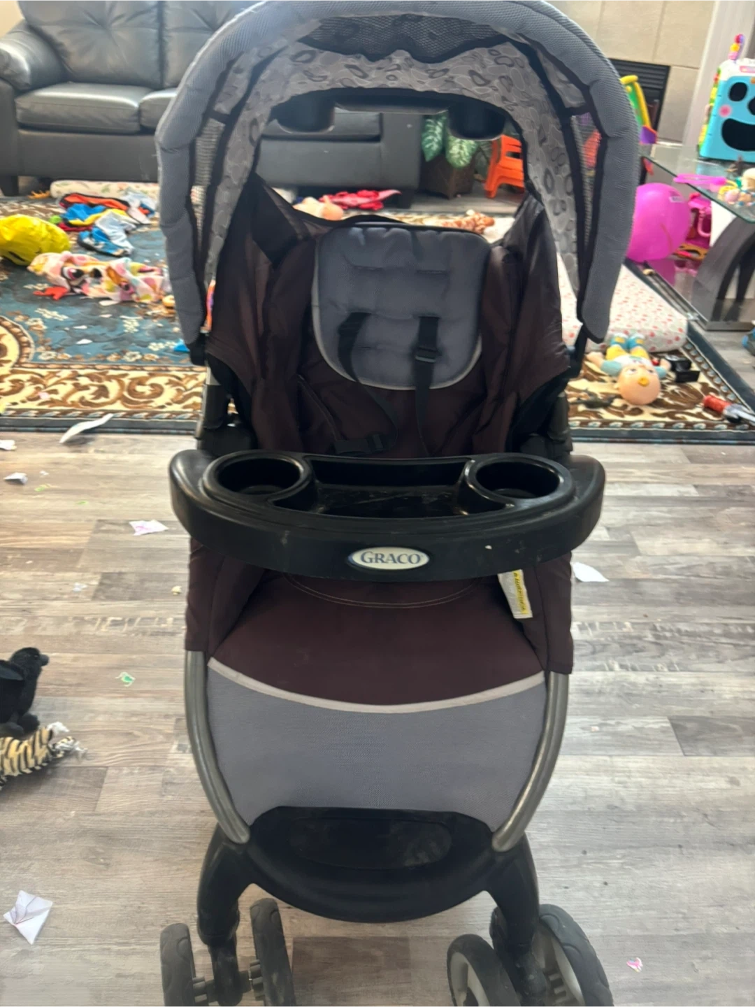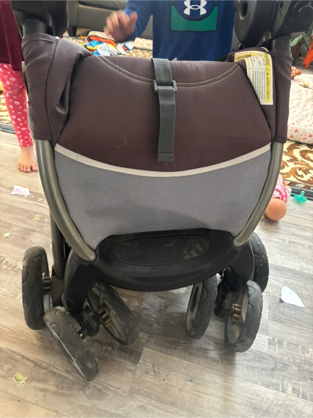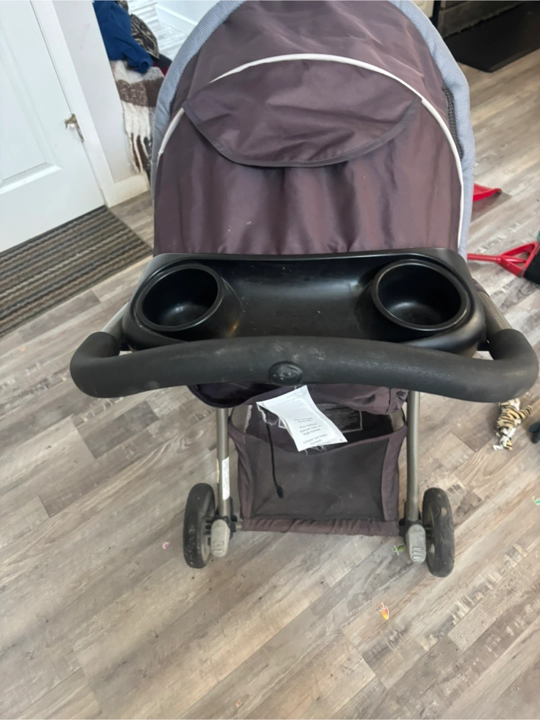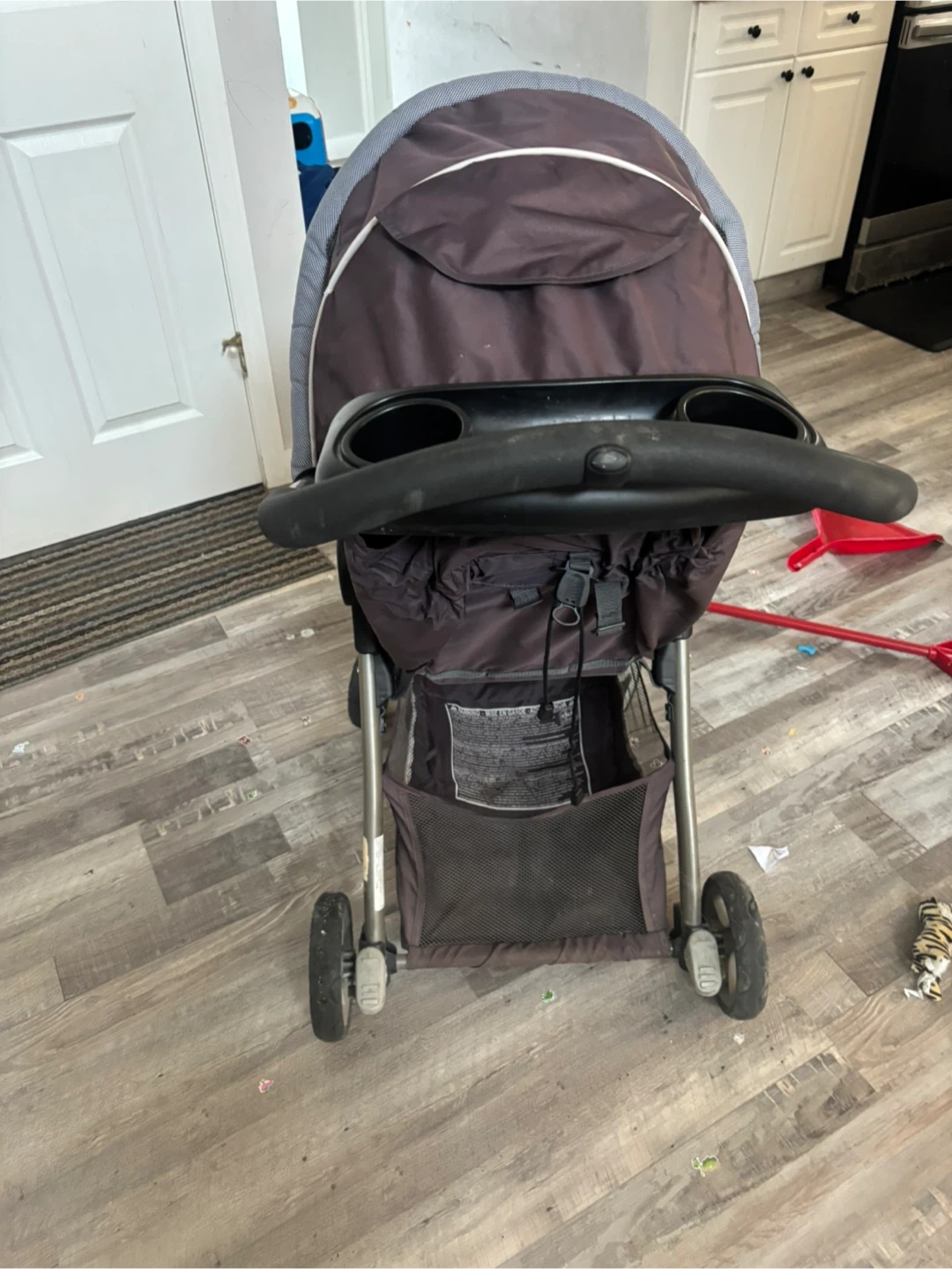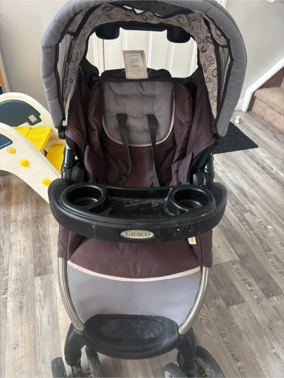 This brown stroller has a 5-point harness for safety. Best for travel easy to fold and taking little space in car compact stroller best for travel. Just need little cleaning , no damage and tear.