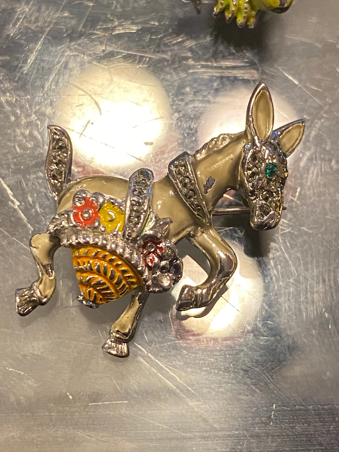 Here's a lovely set of brooches! They feature a yellow sailboat, a lizard, and a donkey. It's all in great condition and would make a charming addition to any collection or outfit... Geco does show some wear but its shown in pics