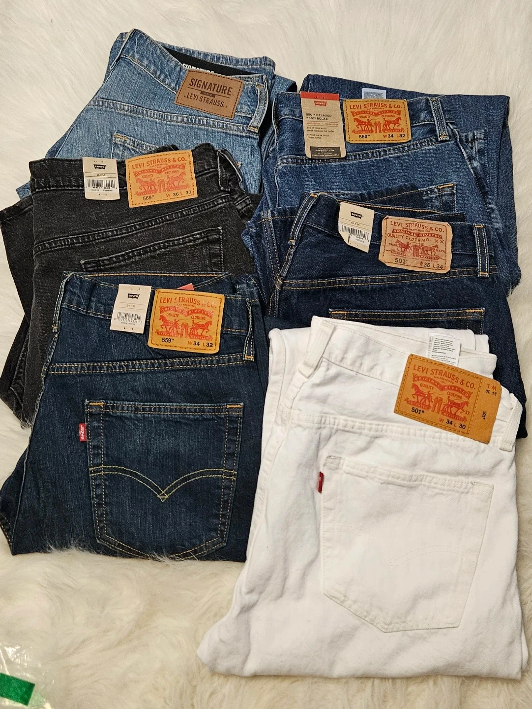 Bundle of various Levi's jeans including 501, 550, 514 styles. Sizes range from 30x32 to 34x34. Mostly denim material with some dark wash and black options. All Brand New! Price is $30 each.