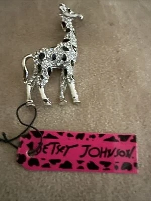 This is a Betsey Johnson giraffe pin brooch. It's in great condition and features a silver-tone finish with black and clear crystal accents. Perfect for adding a touch of whimsy to any outfit!