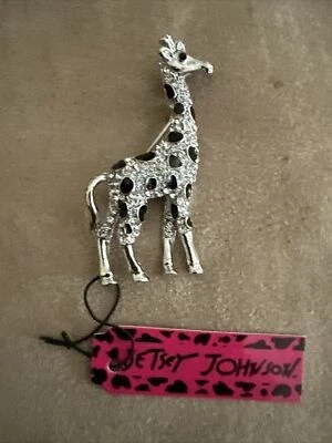 This is a Betsey Johnson giraffe pin brooch. It's in great condition and features a silver-tone finish with black and clear crystal accents. Perfect for adding a touch of whimsy to any outfit!