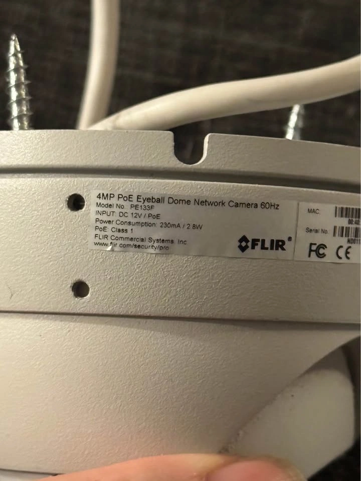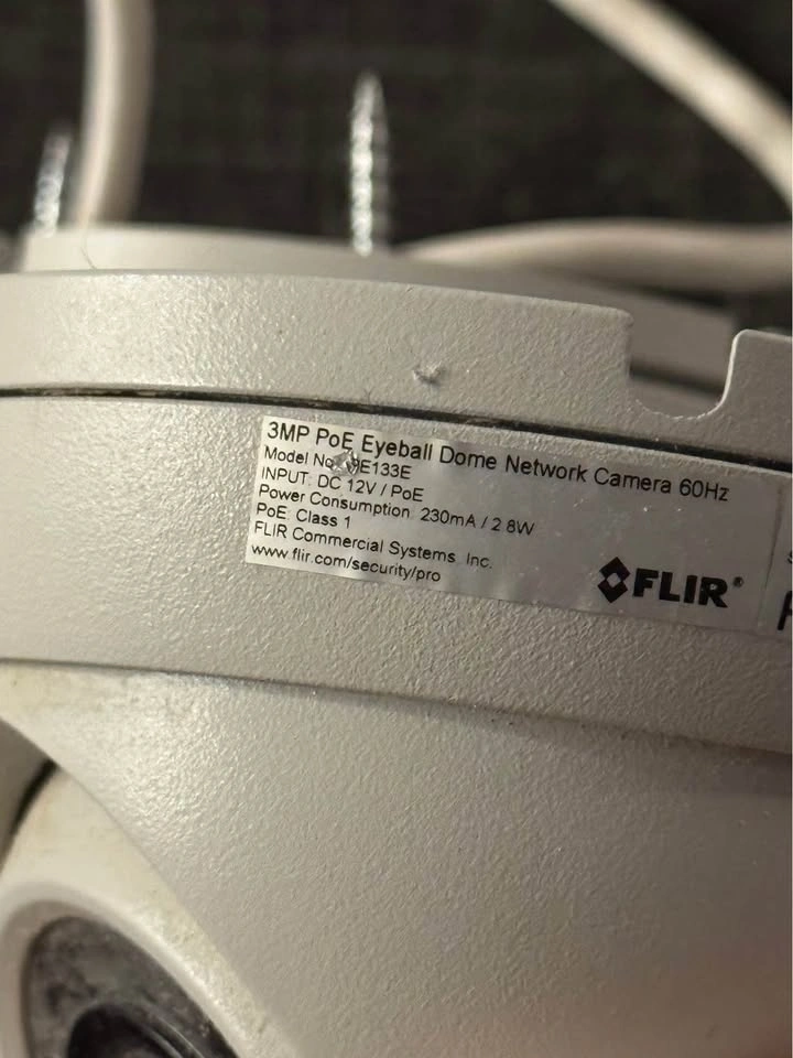 Functional FLIR PoE Eyeball Dome Network Cameras for sale. Have both 3MP (model PE133E) and 4MP (model PE133F) versions. These are Power over Ethernet (PoE) cameras. They can also use DC 12V power. PoE Class 1 with 2.8W power consumption. Good for keeping an eye on things.