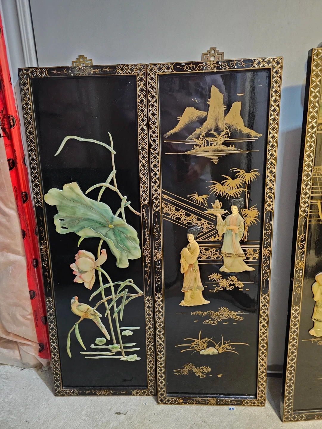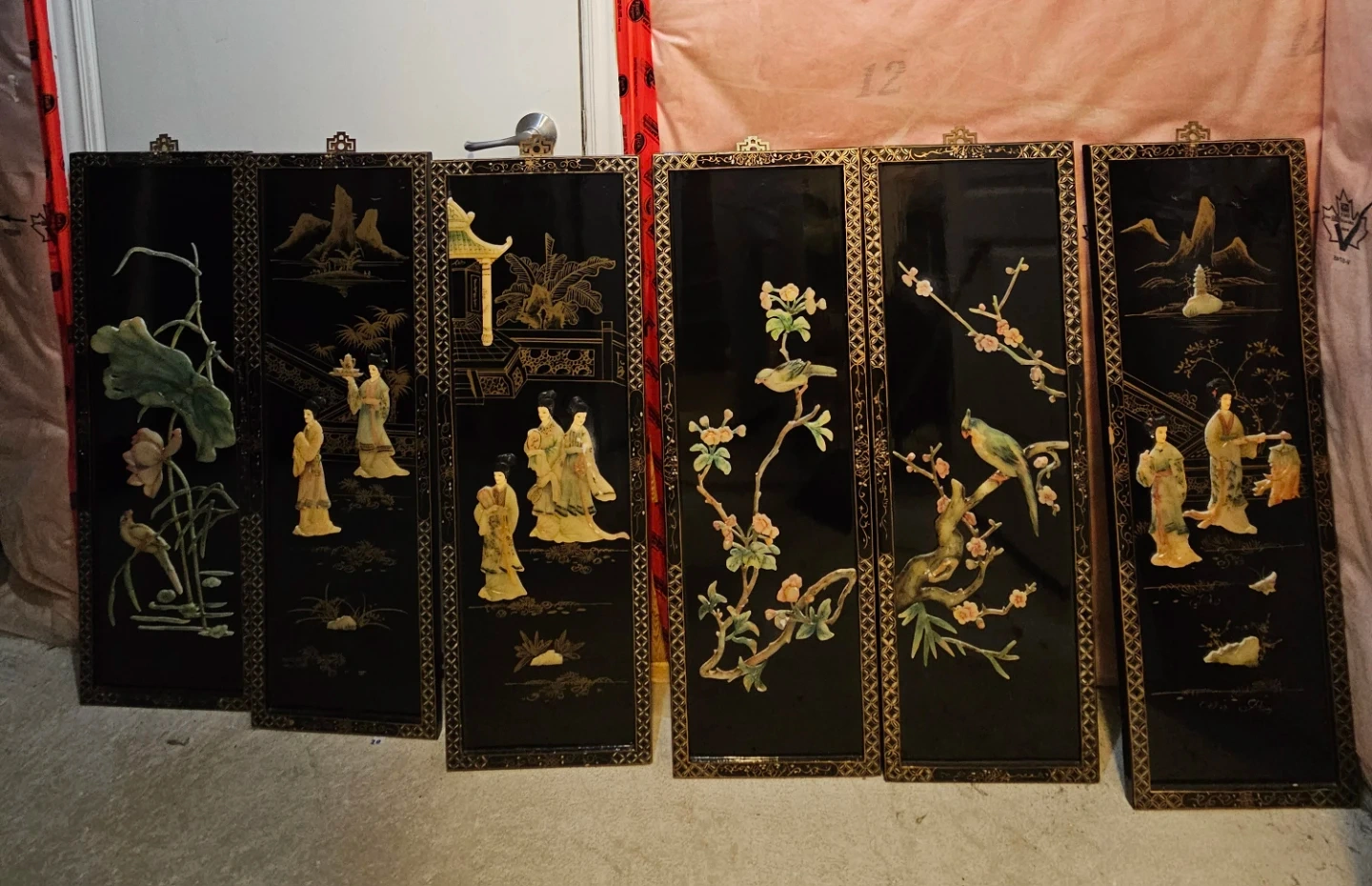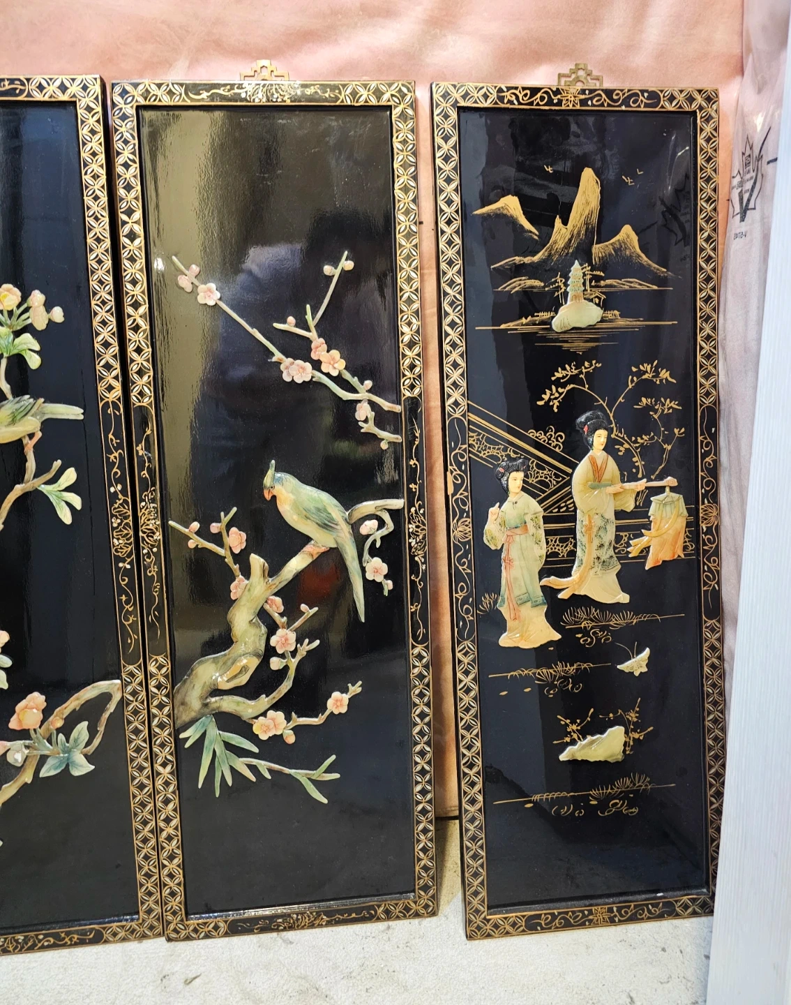This is a set of five decorative wall panels, featuring intricate gilded designs and figures in relief. Each panel showcases traditional scenes with people, nature, and architectural elements. The black lacquer background provides a striking contrast to the detailed artwork. Panels come with hanging hardware attached.