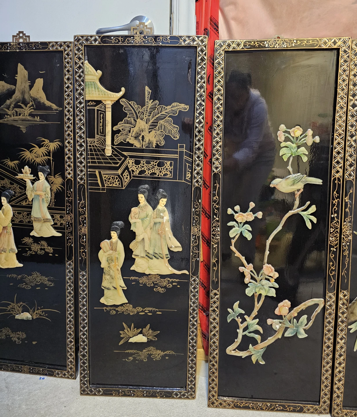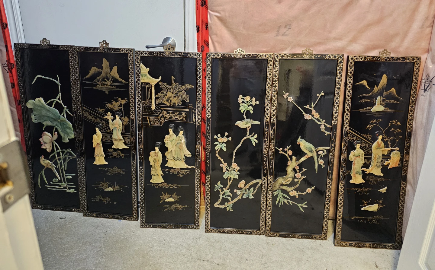 This is a set of five decorative wall panels, featuring intricate gilded designs and figures in relief. Each panel showcases traditional scenes with people, nature, and architectural elements. The black lacquer background provides a striking contrast to the detailed artwork. Panels come with hanging hardware attached.
