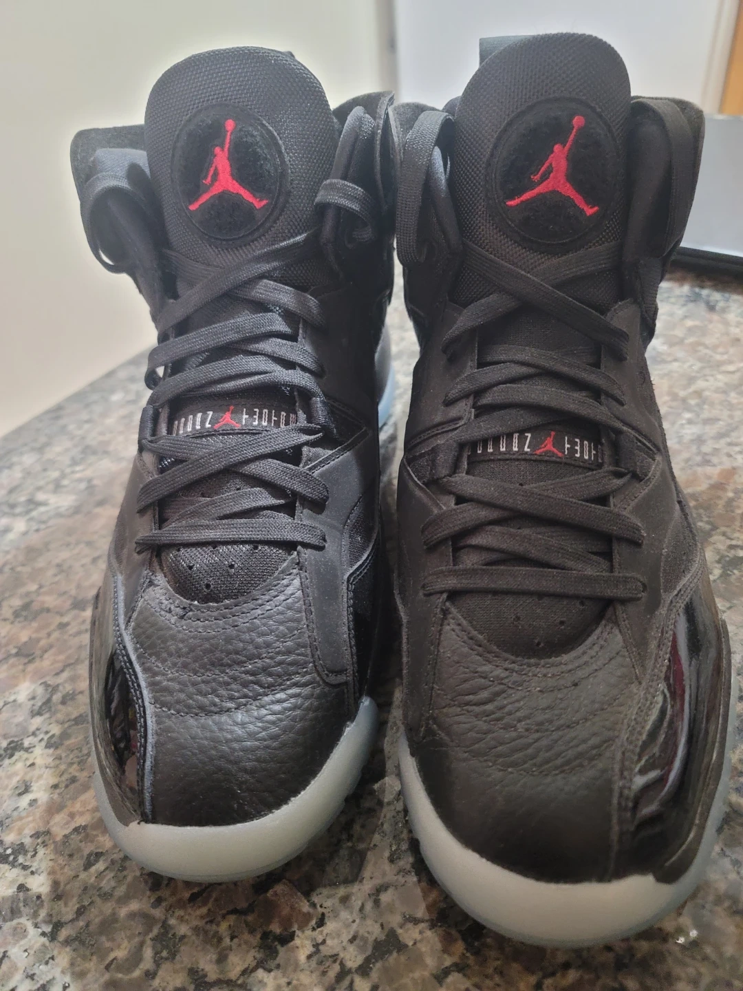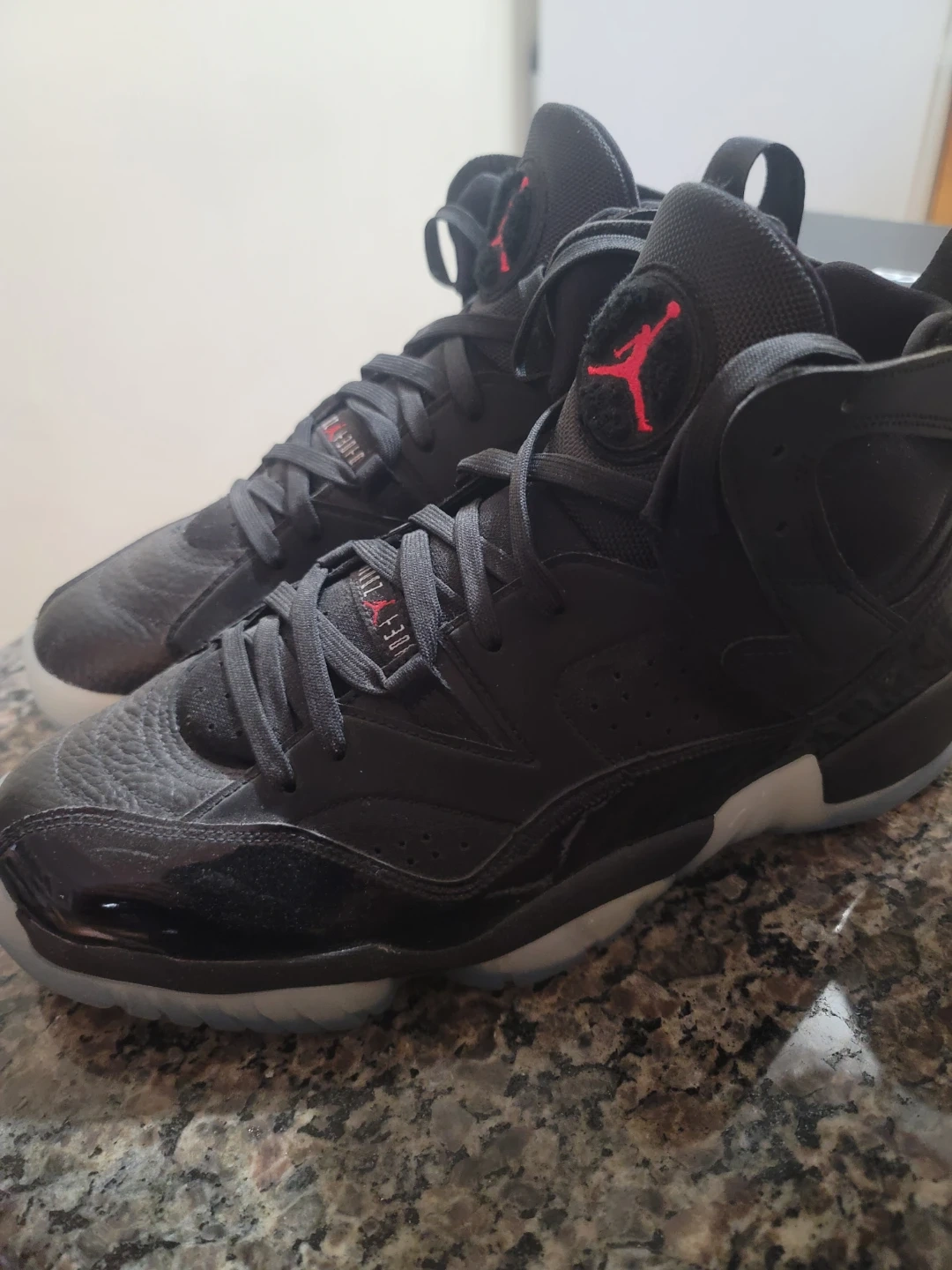These Jordan shoes are black with red accents and a translucent sole. They feature the Jumpman logo on the tongue and heel. Leather and patent leather details are present. No box, but have never been worn. P/U only. $70.