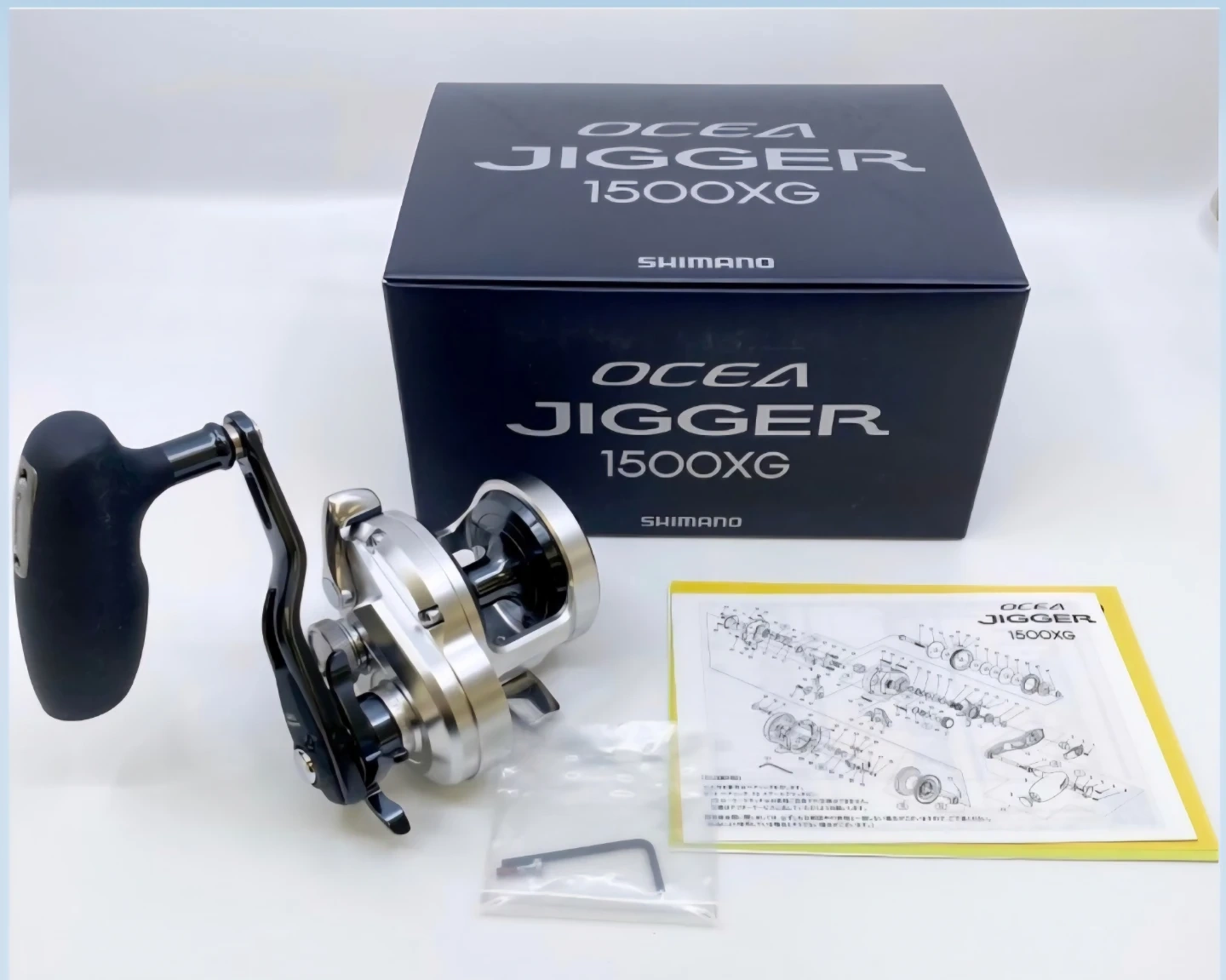 Likely used Shimano OCEA JIGGER 1500XG $450, It's a saltwater jigging reel. Includes manual and hex wrench.