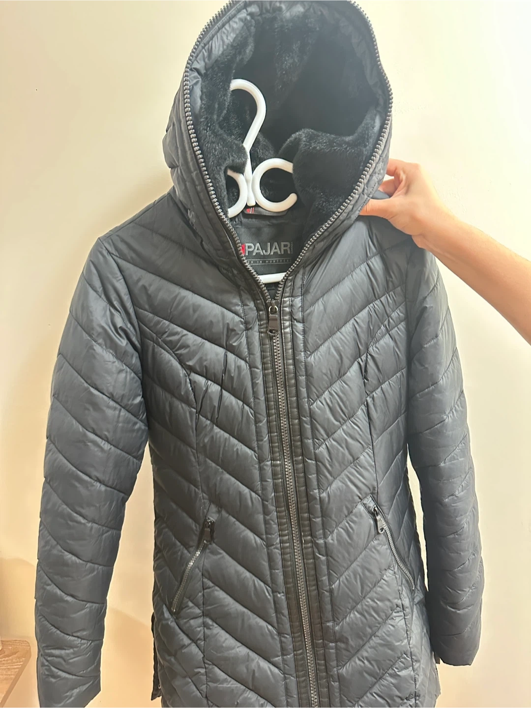 A stylish black Pajar hooded jacket with a quilted design and faux fur trim. It features a full zip closure and zippered pockets. This cozy puffer jacket is perfect for staying warm during colder weather.