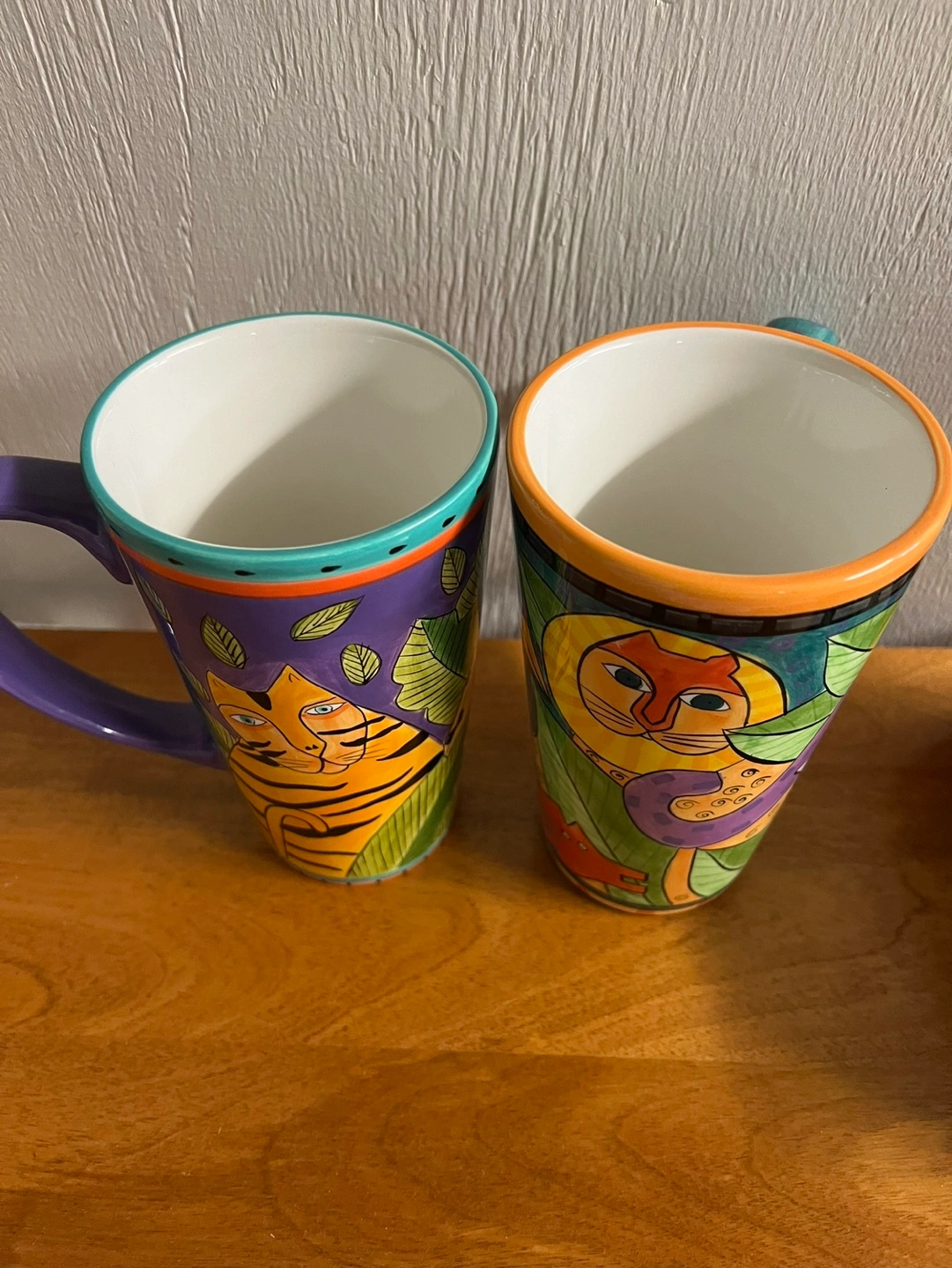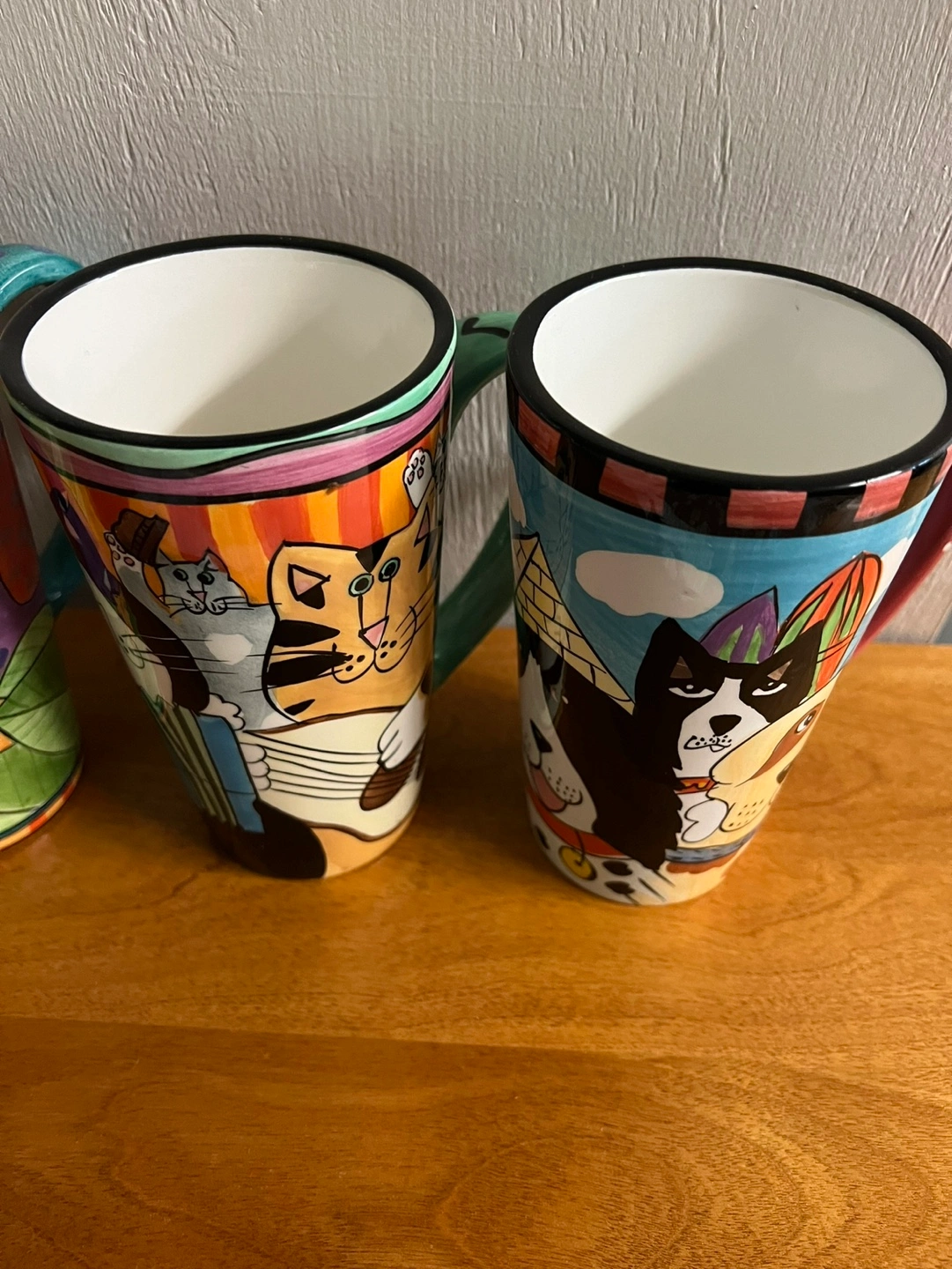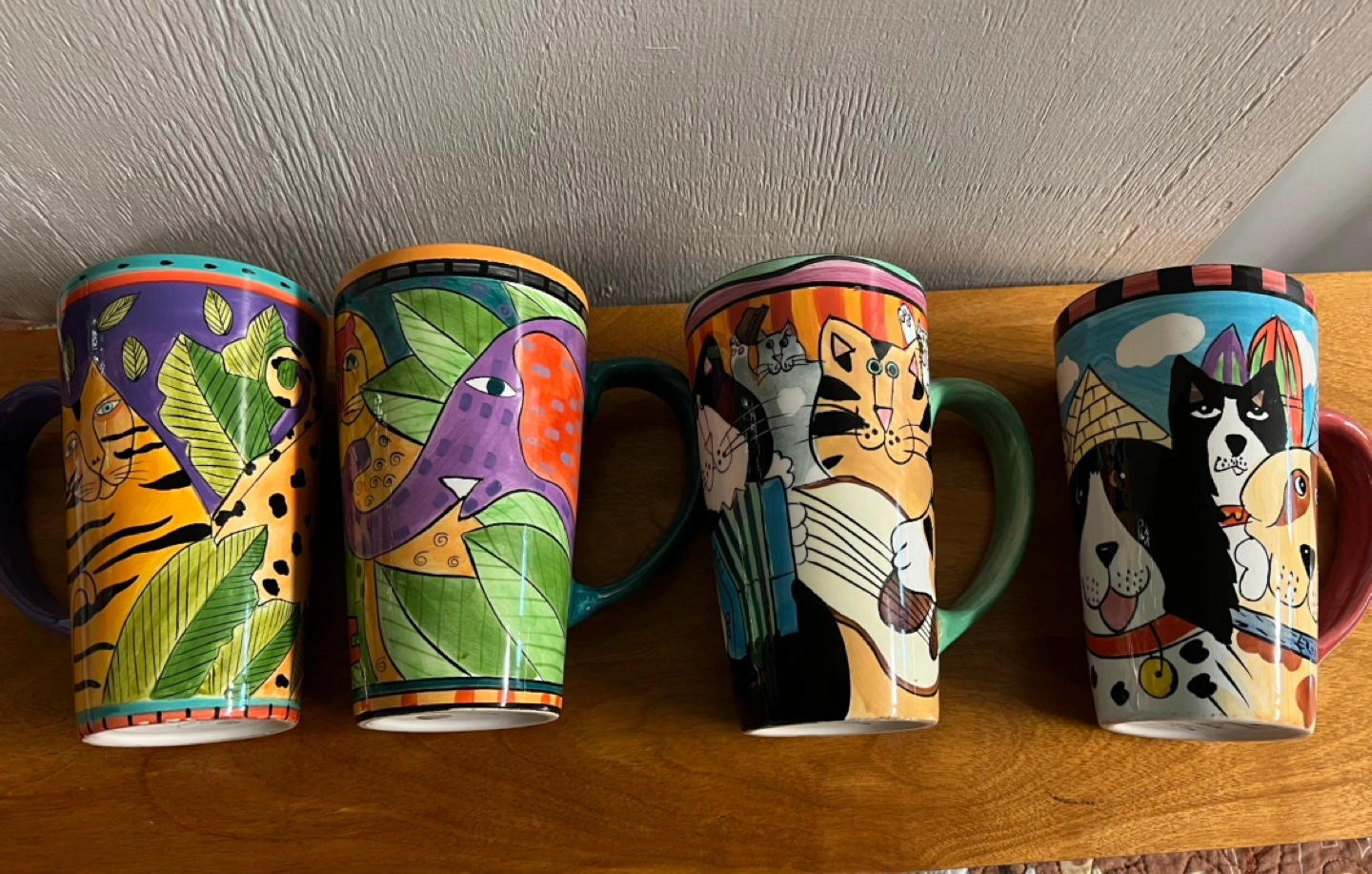 Four large mugs featuring colourful animal designs. Hand-painted designs. Not recommended for microwave or dishwasher use. Excellent condition.