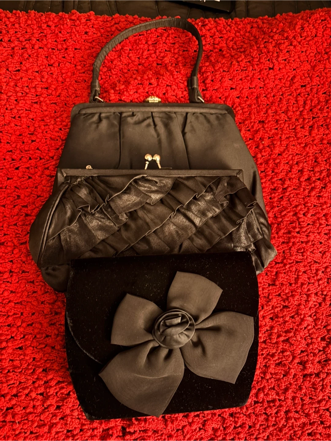 These are. charming black evening clutches.with detailing. It's perfect for a night out or a special occasion. The clutches have unique designs and a classic look that will complement any outfit.