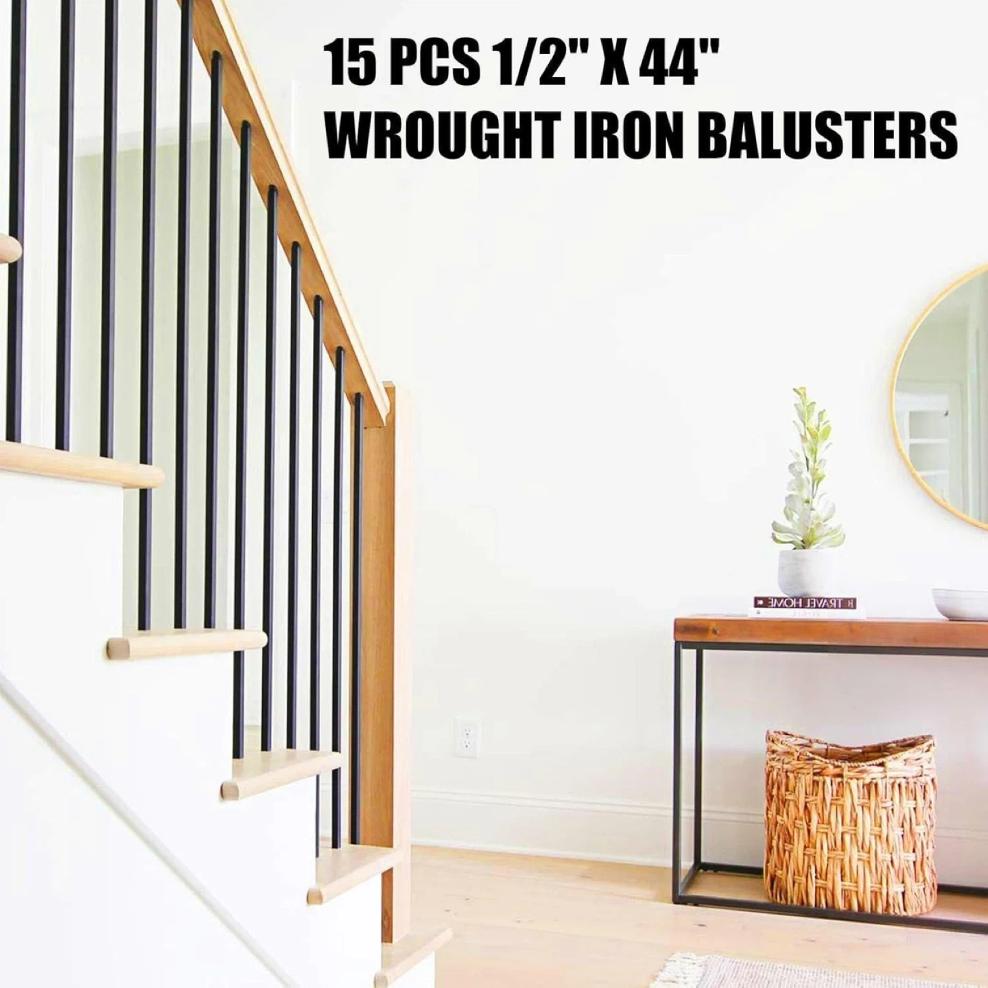 Set of 15 wrought iron balusters, each measuring 44 inches long and 1/2 inch in width. They're a satin black finish and can be cut to different heights. Easy to install for various stair needs.