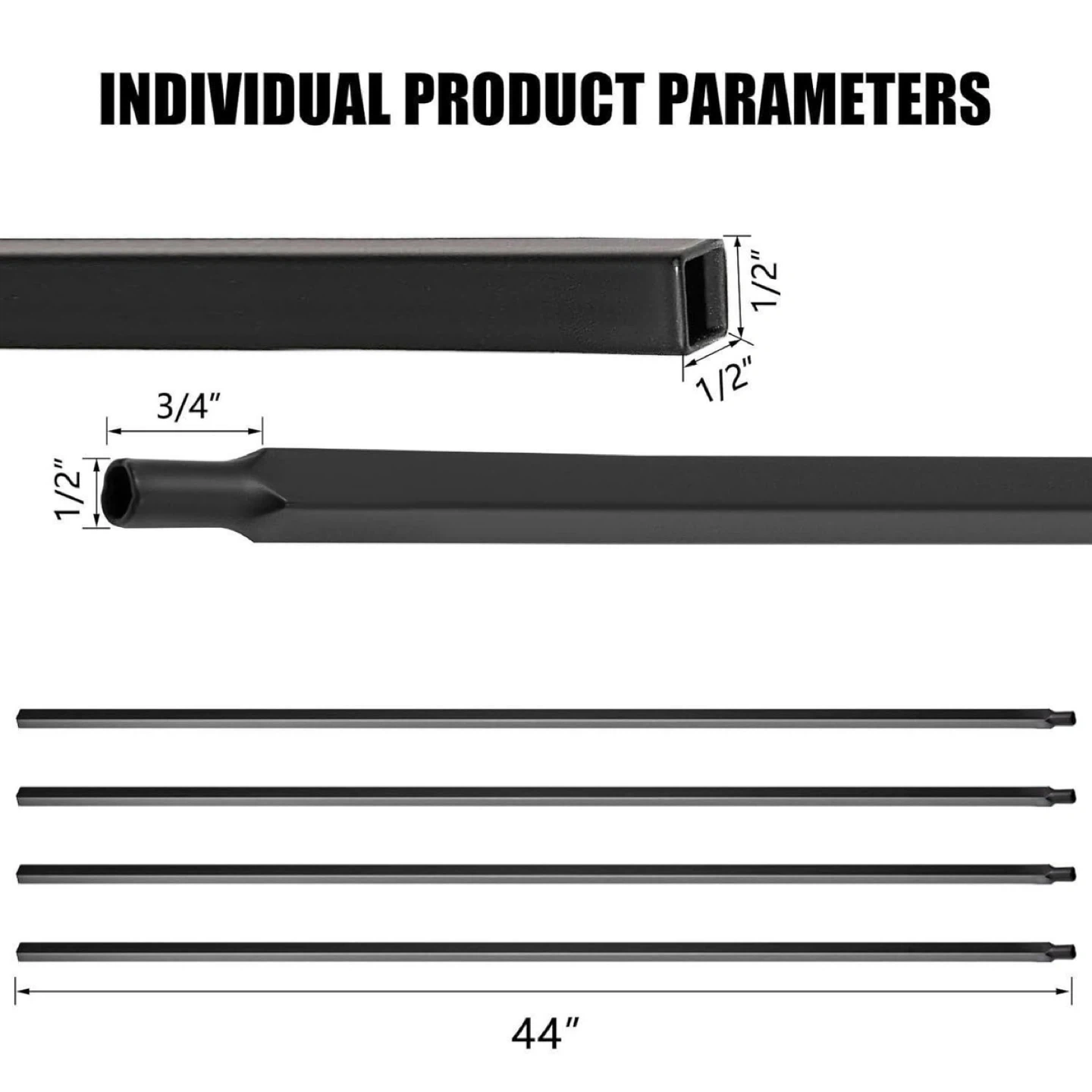 Set of 15 wrought iron balusters, each measuring 44 inches long and 1/2 inch in width. They're a satin black finish and can be cut to different heights. Easy to install for various stair needs.