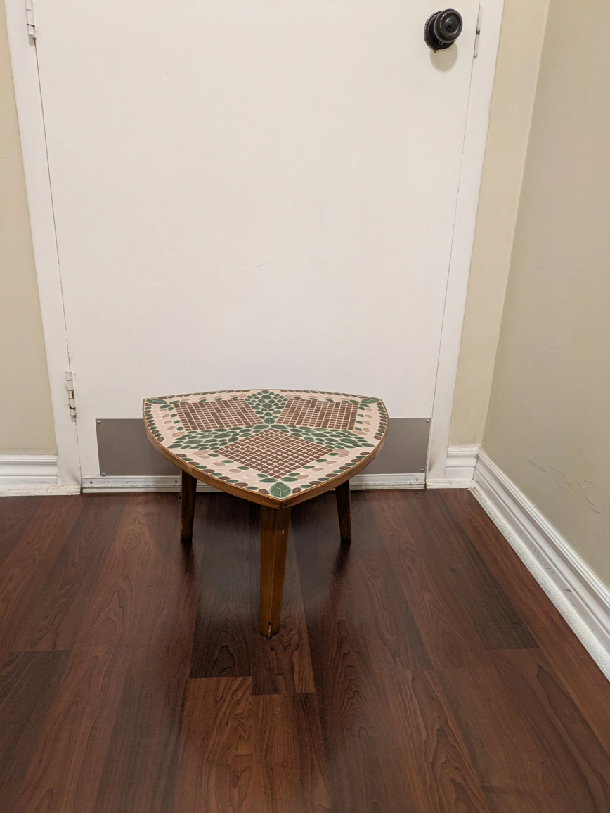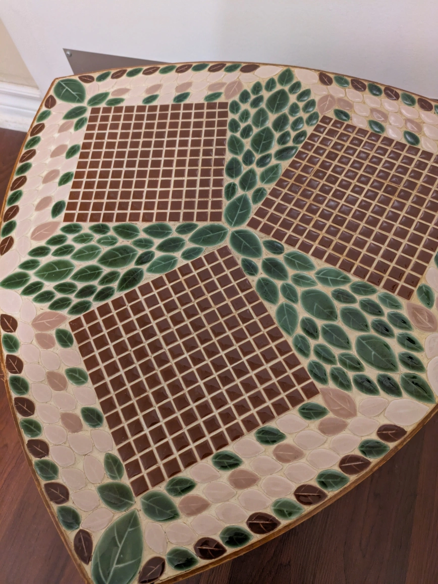 Beautiful mosaic tile accent table in a unique shield shape. The tiles are a mix of brown, green, and beige, creating a lovely pattern. It's a great piece to add some character to any room. Can an be used as an accent table or plant stand etc.