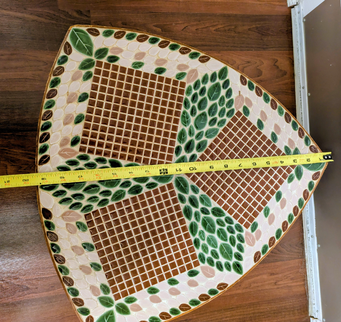Beautiful mosaic tile accent table in a unique shield shape. The tiles are a mix of brown, green, and beige, creating a lovely pattern. It's a great piece to add some character to any room. Can an be used as an accent table or plant stand etc.